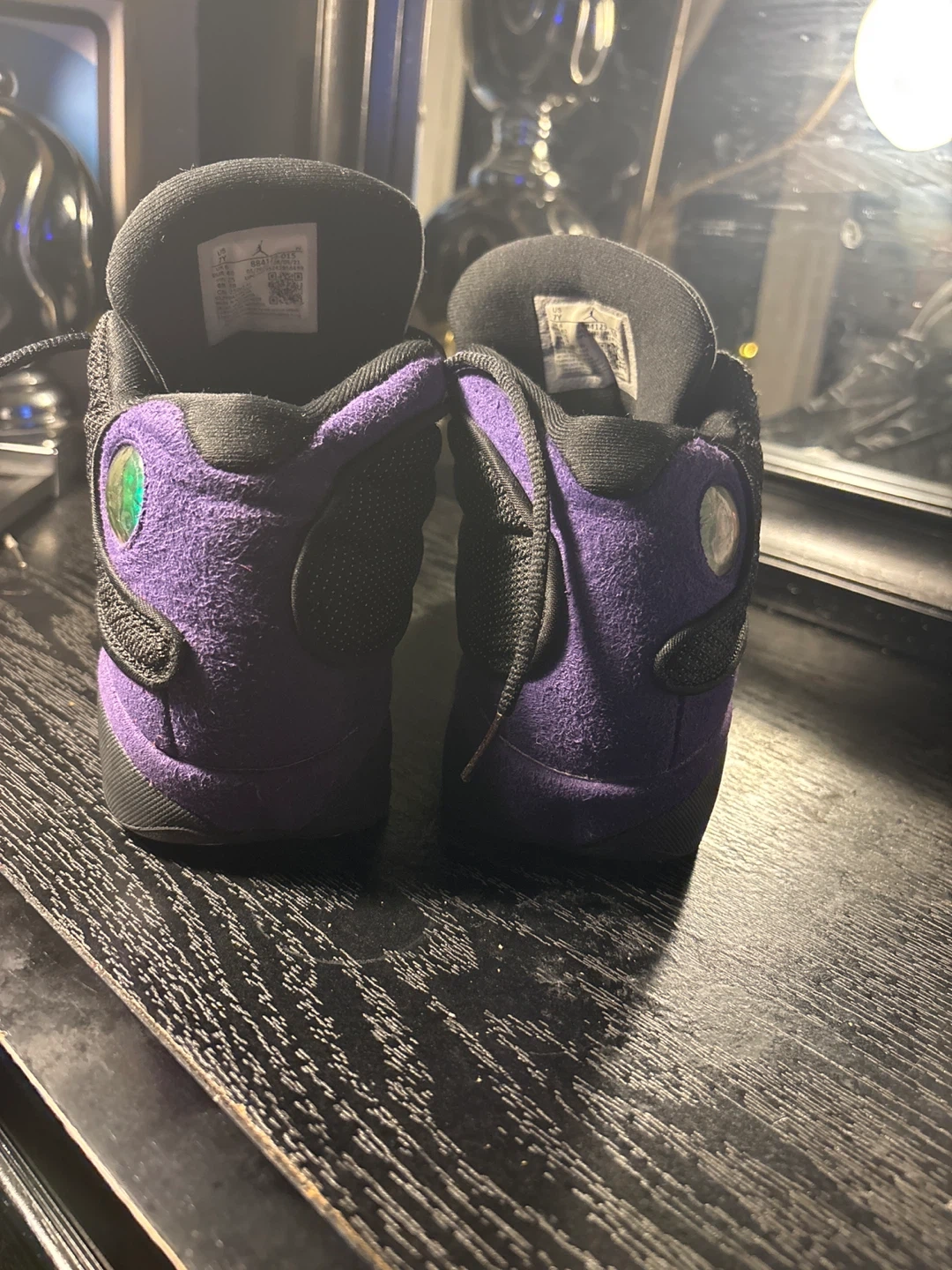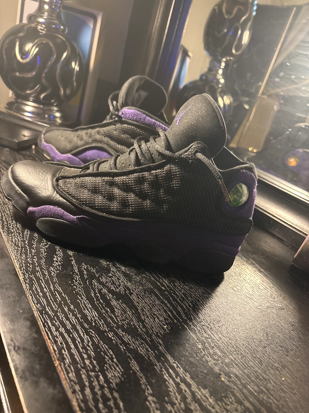 Selling a pair of Jordan 13 Retro sneakers in black and purple. These are a youth size 7Y, so they're perfect for a younger sneakerhead or someone with smaller feet! They're in great condition and ready for a new owner.