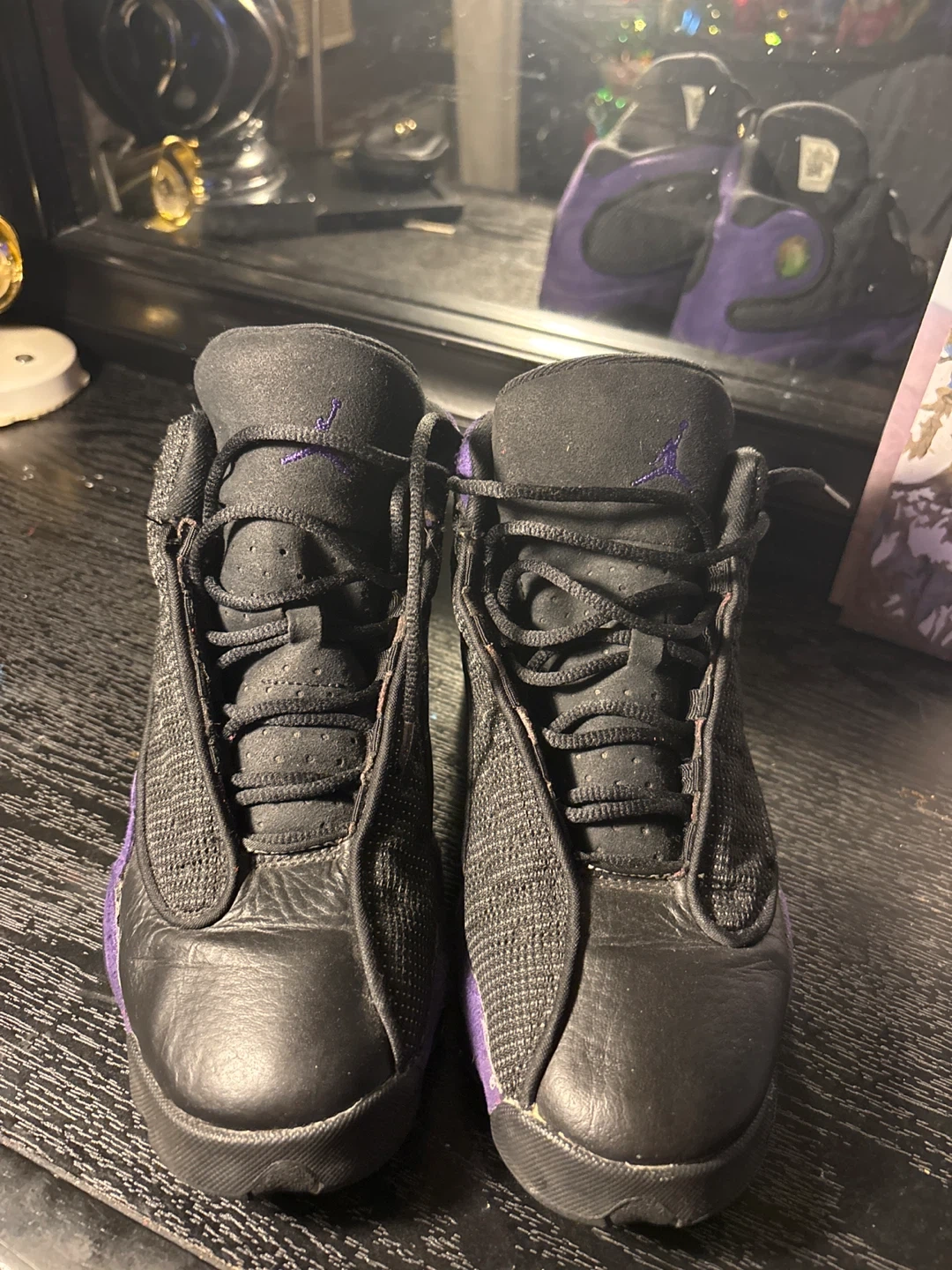 Selling a pair of Jordan 13 Retro sneakers in black and purple. These are a youth size 7Y, so they're perfect for a younger sneakerhead or someone with smaller feet! They're in great condition and ready for a new owner.