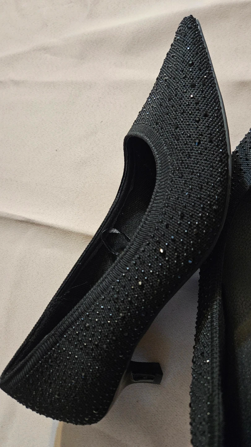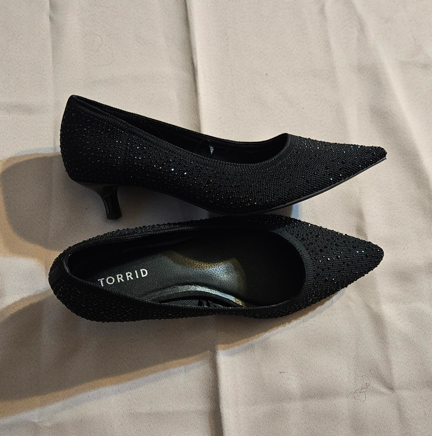 Selling a pair of Torrid black pointed toe kitten heels in size 9.5 wide. These stylish heels are perfect for adding a touch of elegance to any outfit