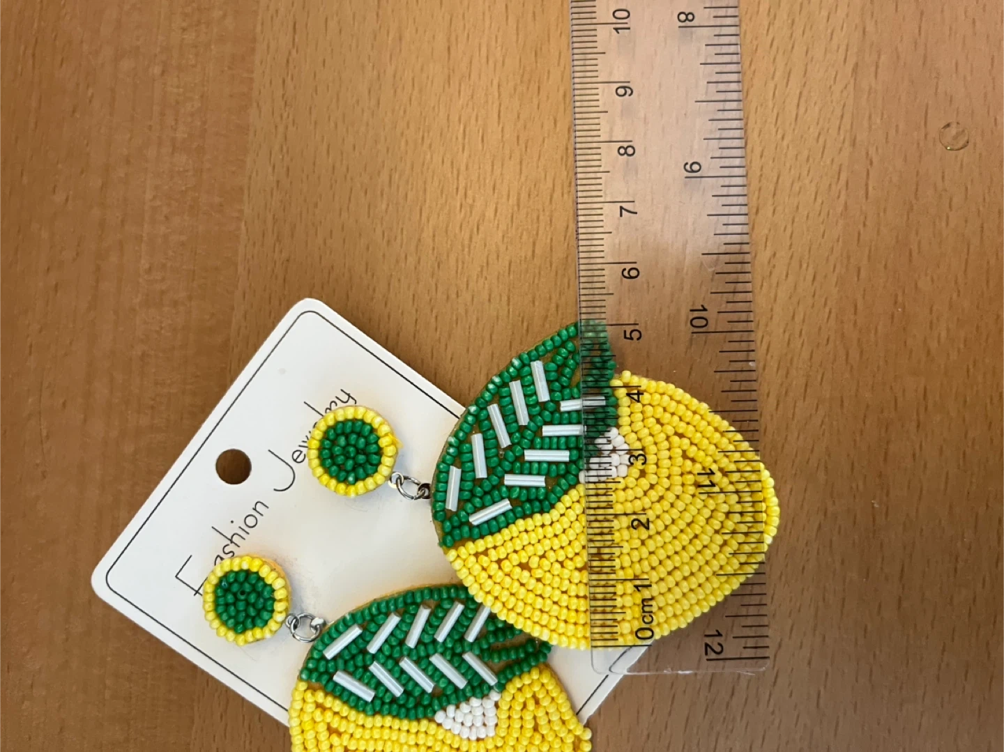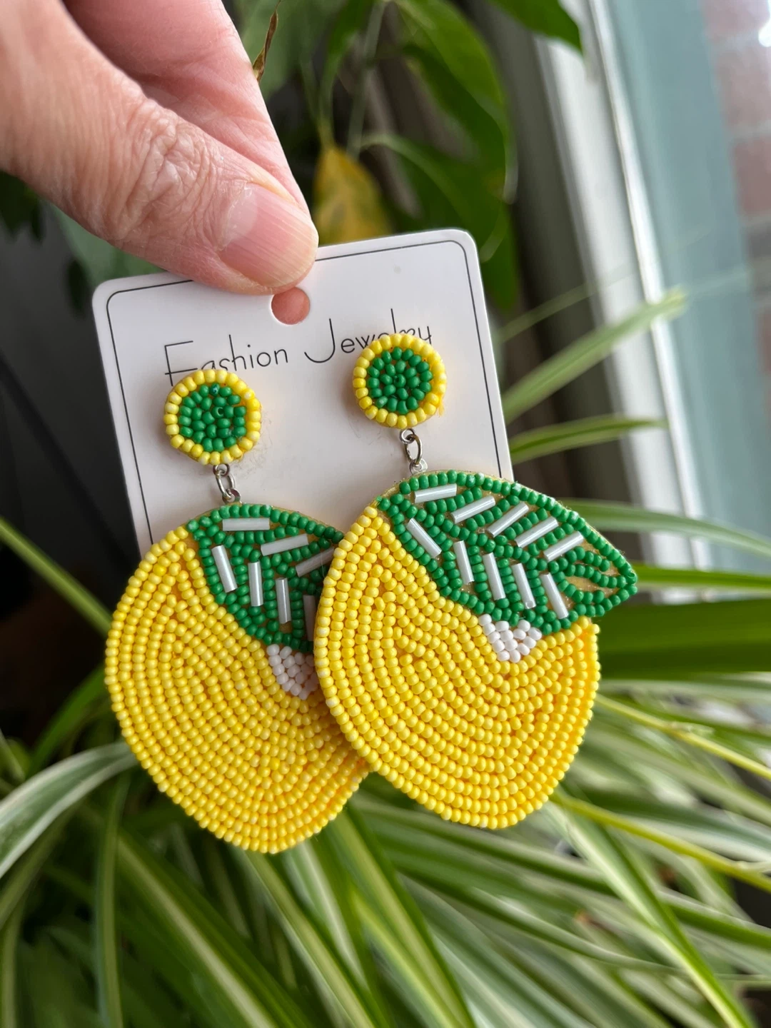 Cute beaded lemon earrings! The earrings have a yellow lemon with green and white accents. Neat finishing