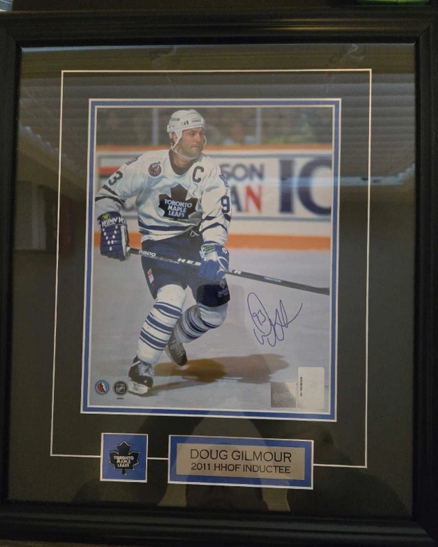 17 inches tall by 15 inches wide. Doug Gilmore Autographed framed picture. Comes with certificate of authenticity from frameworth. Like new condition no marks or cracks. $100 pickup is in Binbrook.