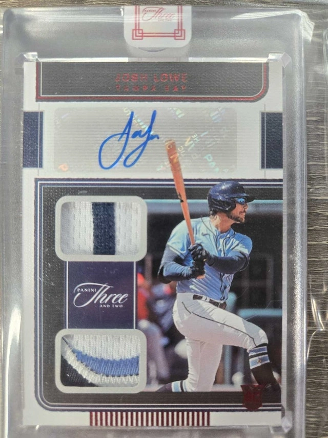 2022 Panini Three and Two Josh Lowe Baseball Rookie Patch Auto Card. Super Short Print 1/3. Red foil first off the line. $80 pickup is in Binbrook.