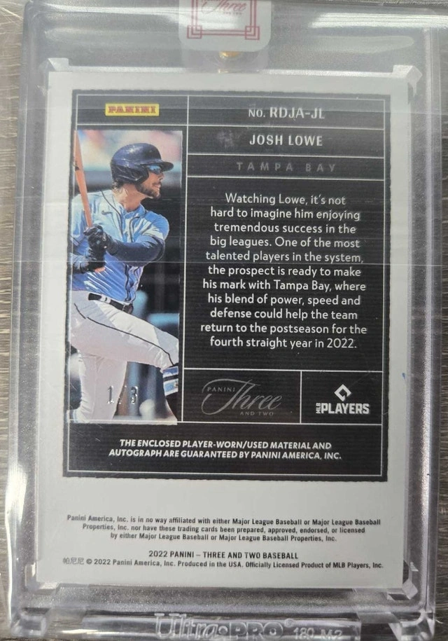 2022 Panini Three and Two Josh Lowe Baseball Rookie Patch Auto Card. Super Short Print 1/3. Red foil first off the line. $80 pickup is in Binbrook.