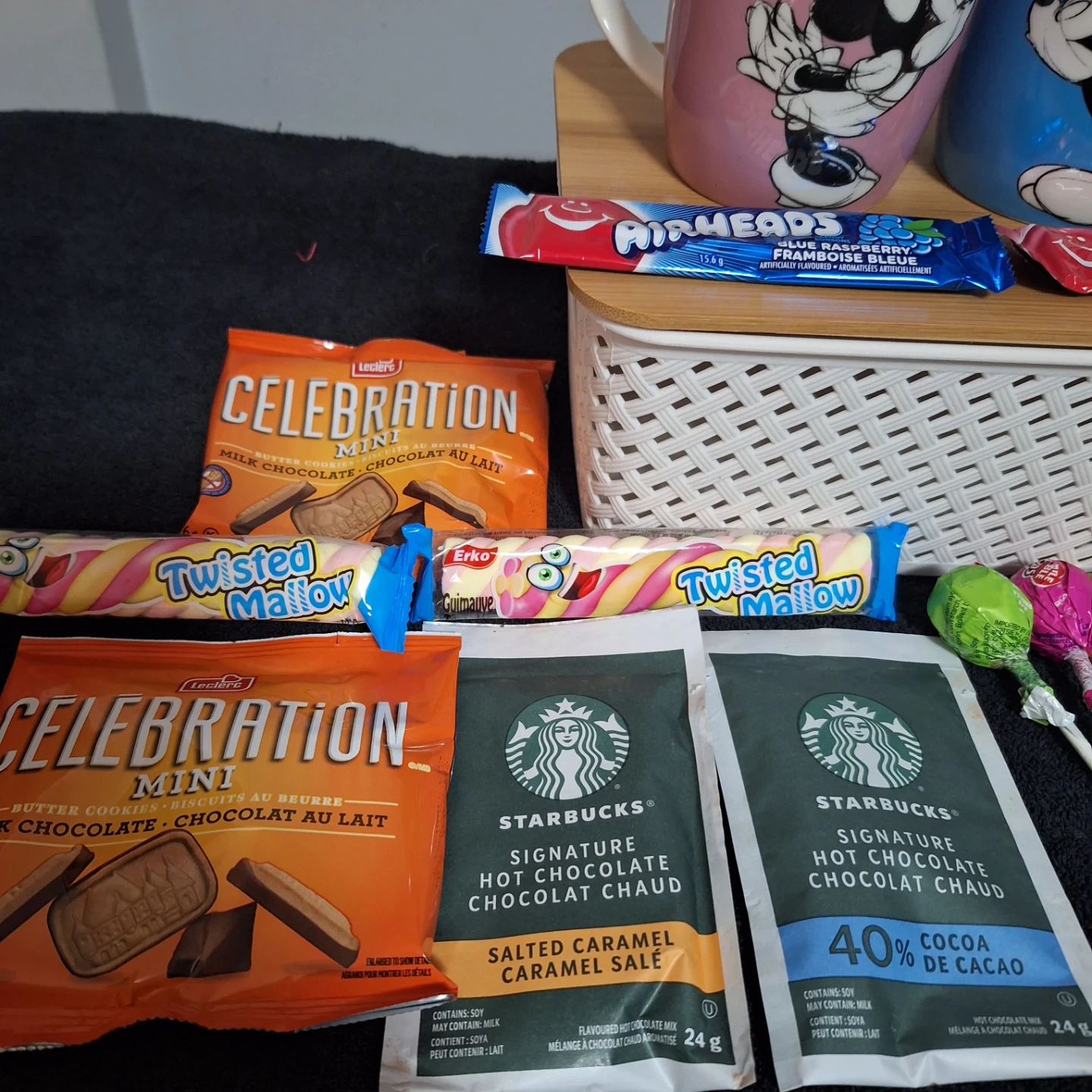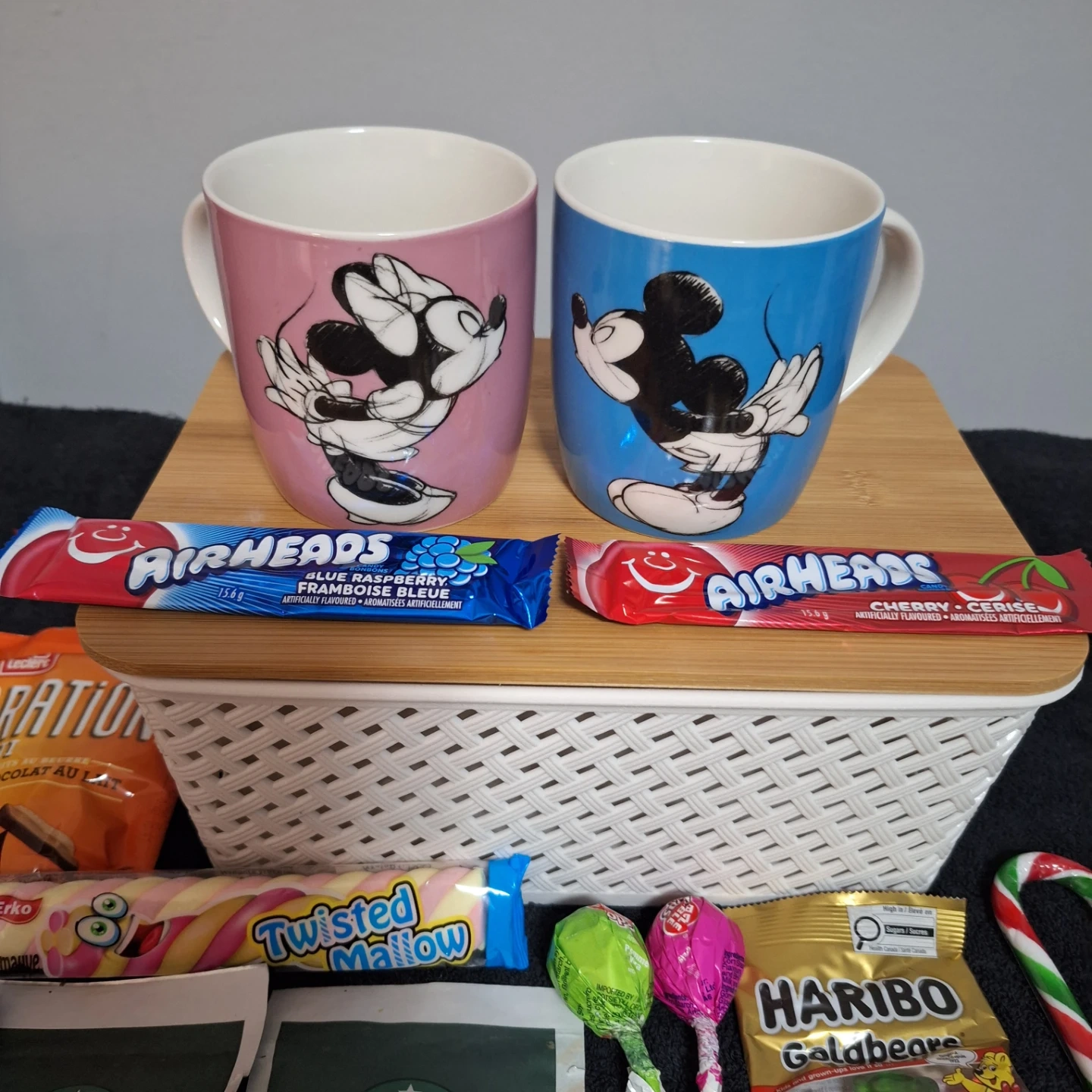 Selling a cute Christmas gift basket! It includes two Disney mugs (Mickey and Minnie), assorted candies, and a festive bow. Perfect as a holiday gift!