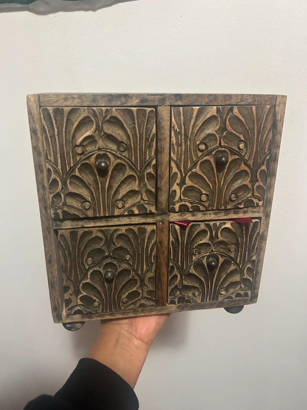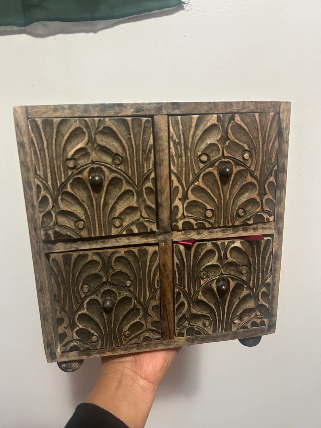 Selling a cute wooden storage box with four drawers! It has a beautiful carved design on the front. Perfect for storing small items like jewelry or craft supplies. It's in great condition and ready for a new home!