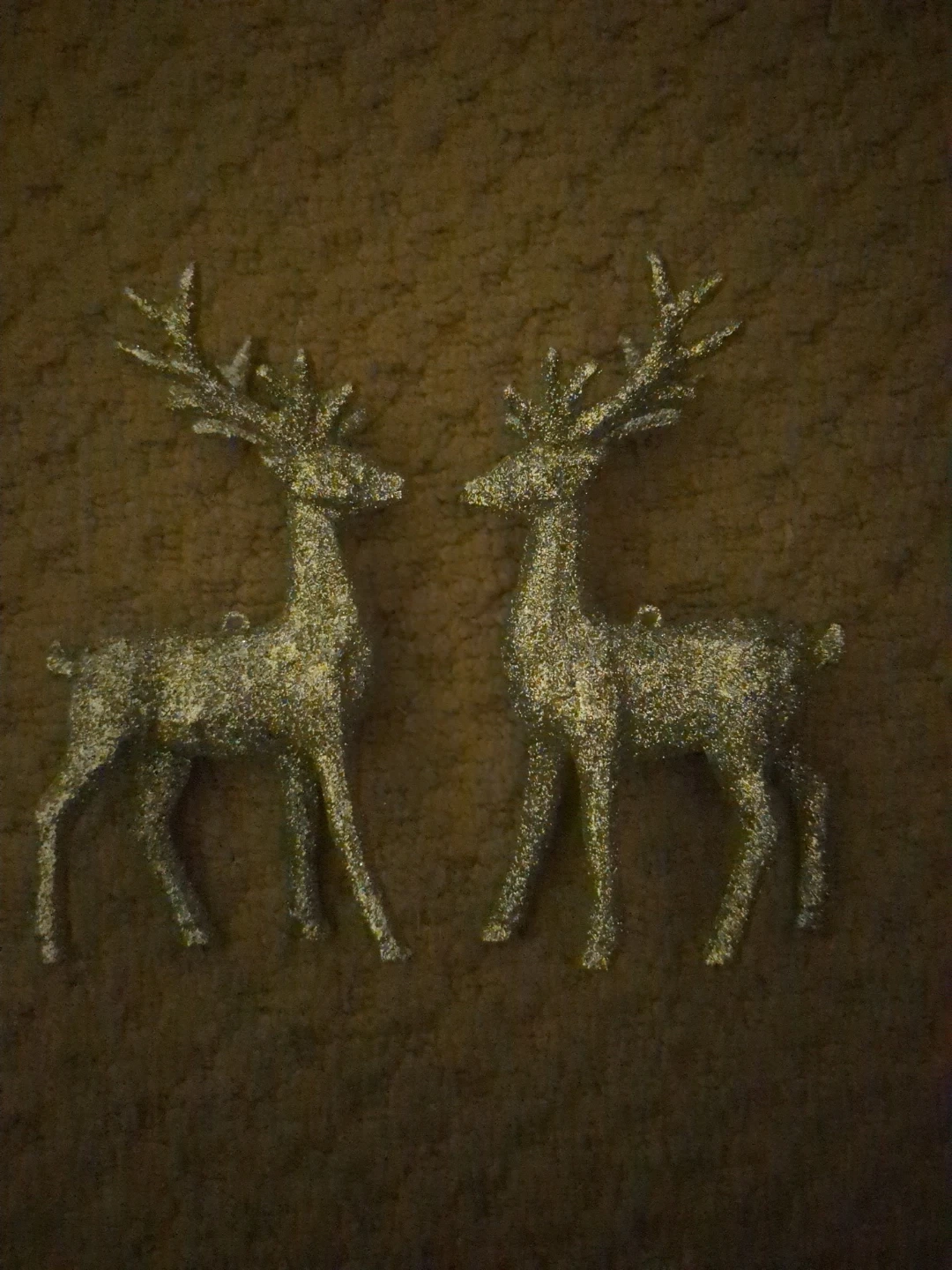 Two glittery reindeer ornaments, perfect for adding a touch of sparkle to your holiday decor!