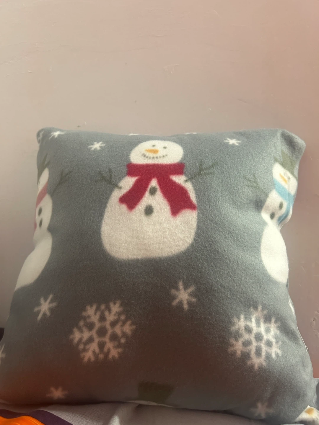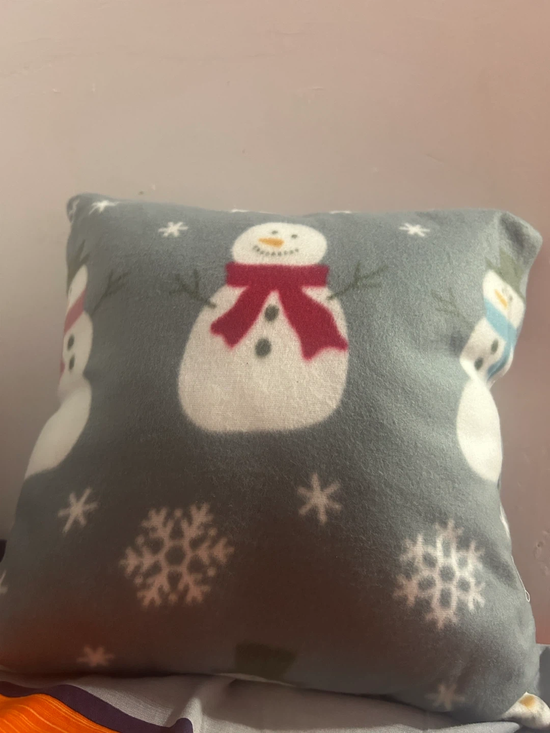 A cute decorative pillow with a snowman and snowflake pattern! It's in great condition and would be perfect for adding a touch of winter cheer to any room. Will Provide a pillow cover.