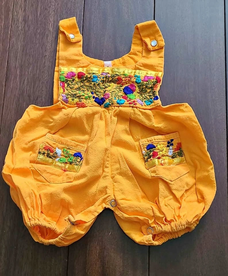 This adorable handmade baby romper is perfect for your little one! It features beautiful embroidery details and a vibrant yellow colour. It's in great condition and ready for a new home! Size for 0-3 months