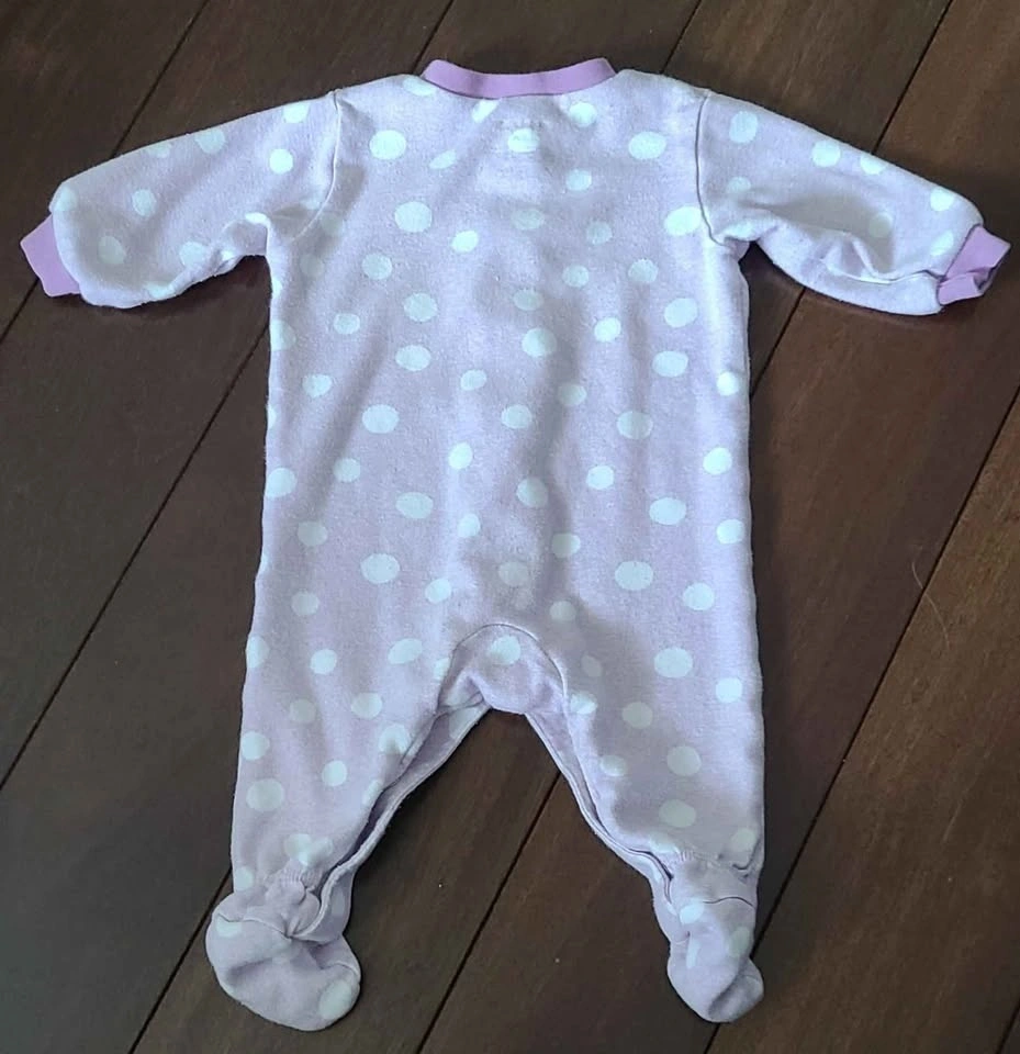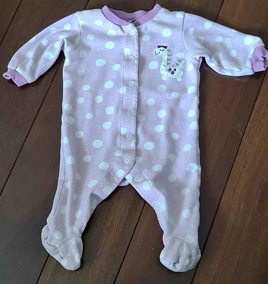 Here's a cozy baby sleeper from Carter's! It's light pink with white polka dots and features a cute giraffe applique. Perfect for keeping your little one snug during naps or bedtime. size 3 months
