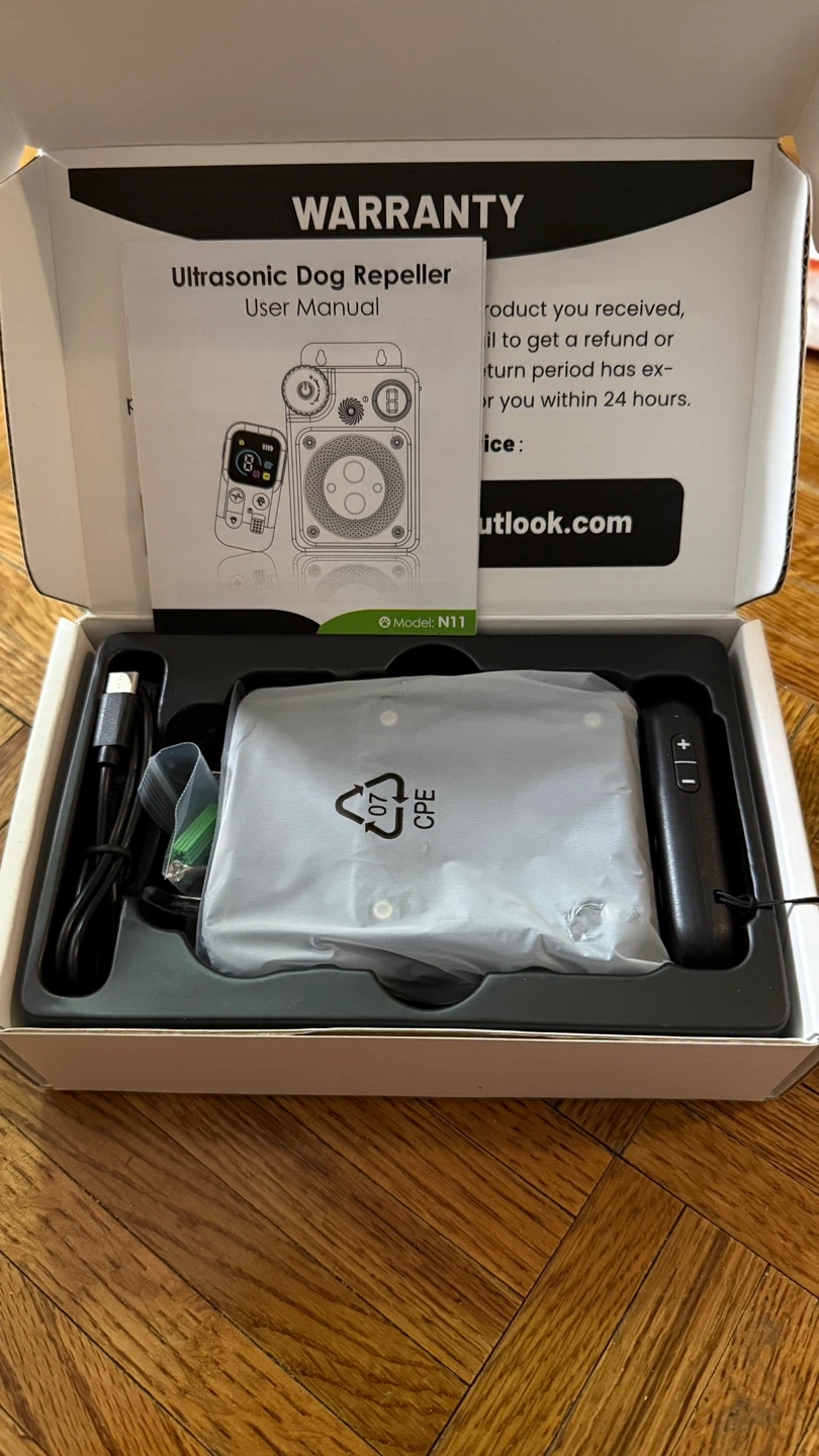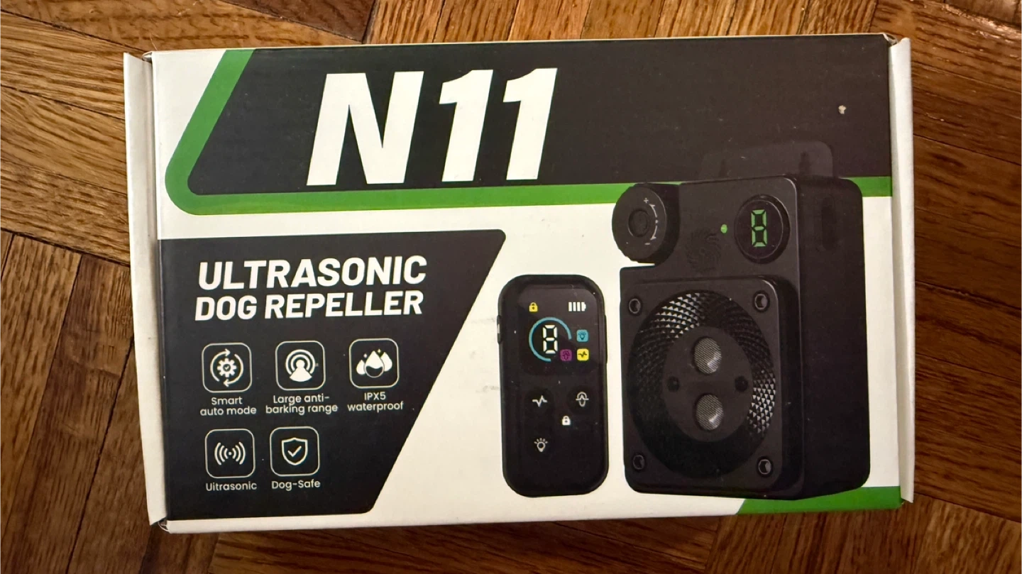 I'm selling a new N11 Ultrasonic Dog Repeller. It features smart auto mode, large anti-barking range, and is waterproof. It's also dog-safe and has a 50ft max control range. The box and user manual are included!