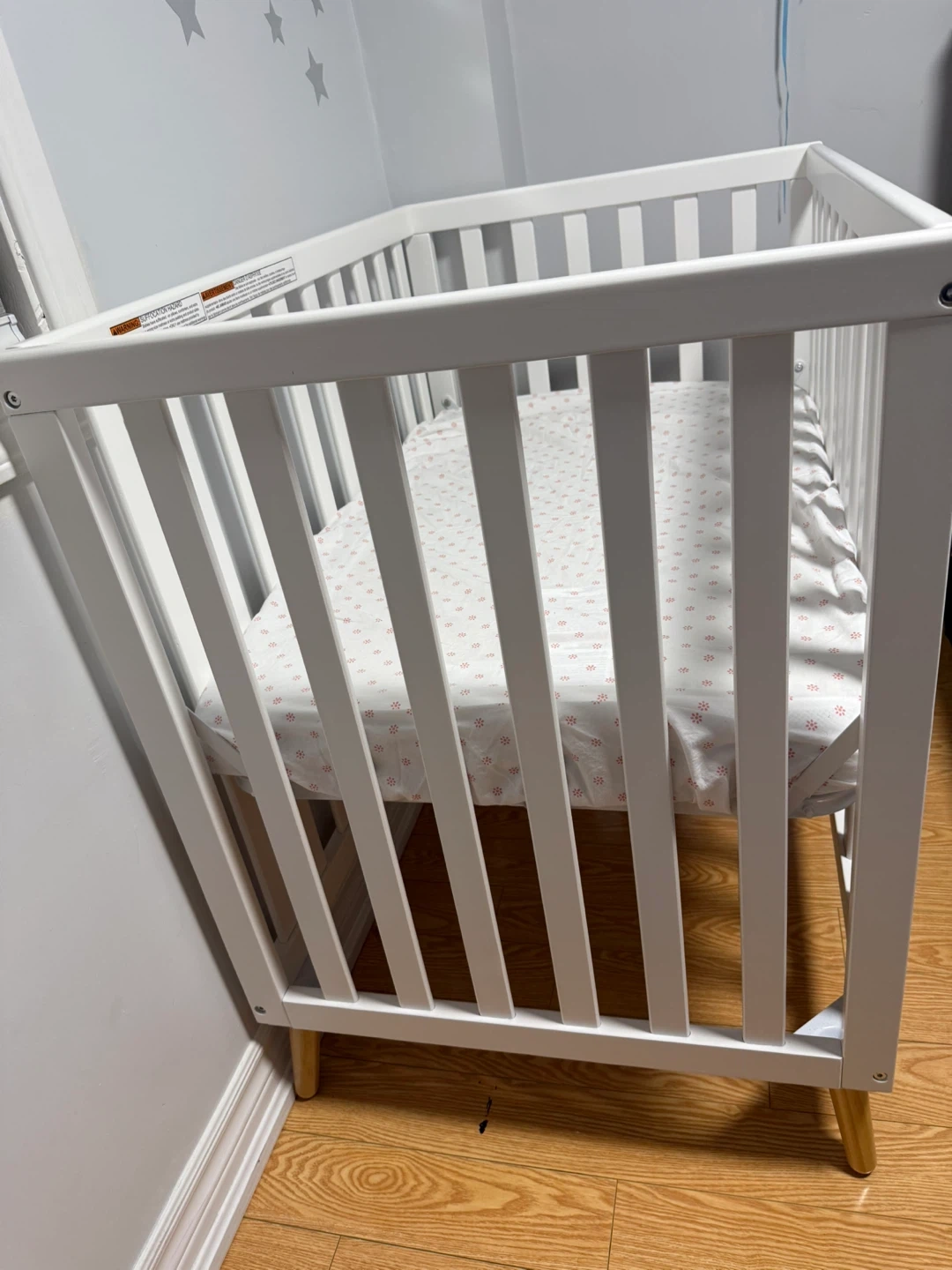 Selling a Delta Children mini crib in white! It's in great condition and comes with the mattress and box.Perfect for smaller spaces or as a secondary crib and it’s never ever been used.