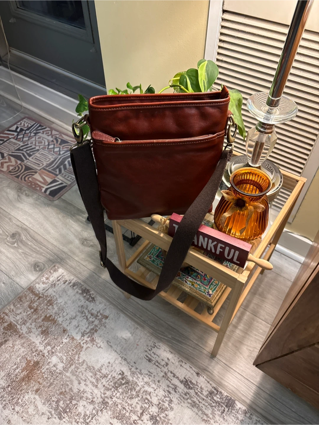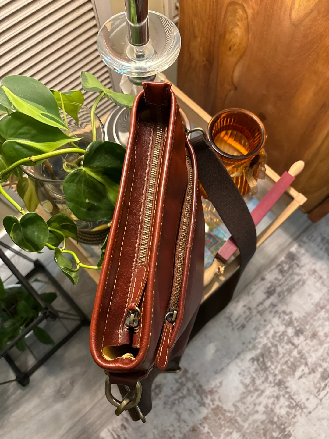 Selling a lovely brown leather crossbody bag! It's in great condition and perfect for everyday use. The bag features a zipper and a long adjustable strap. It's a stylish and practical accessory to keep your essentials organized