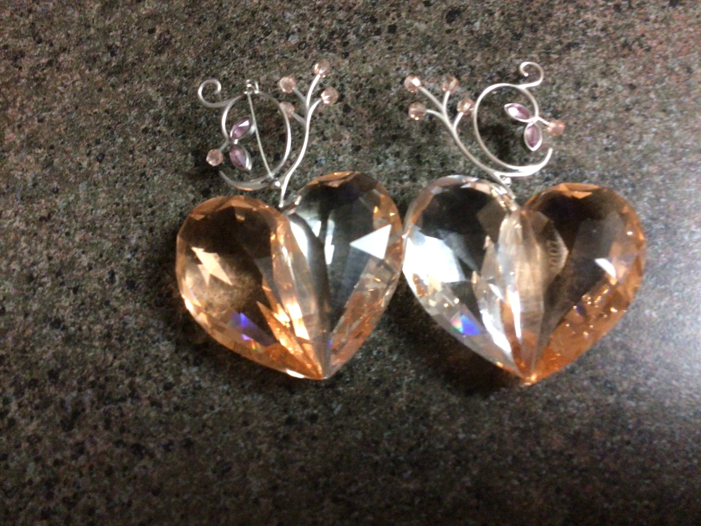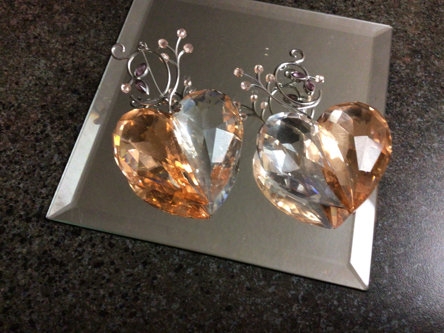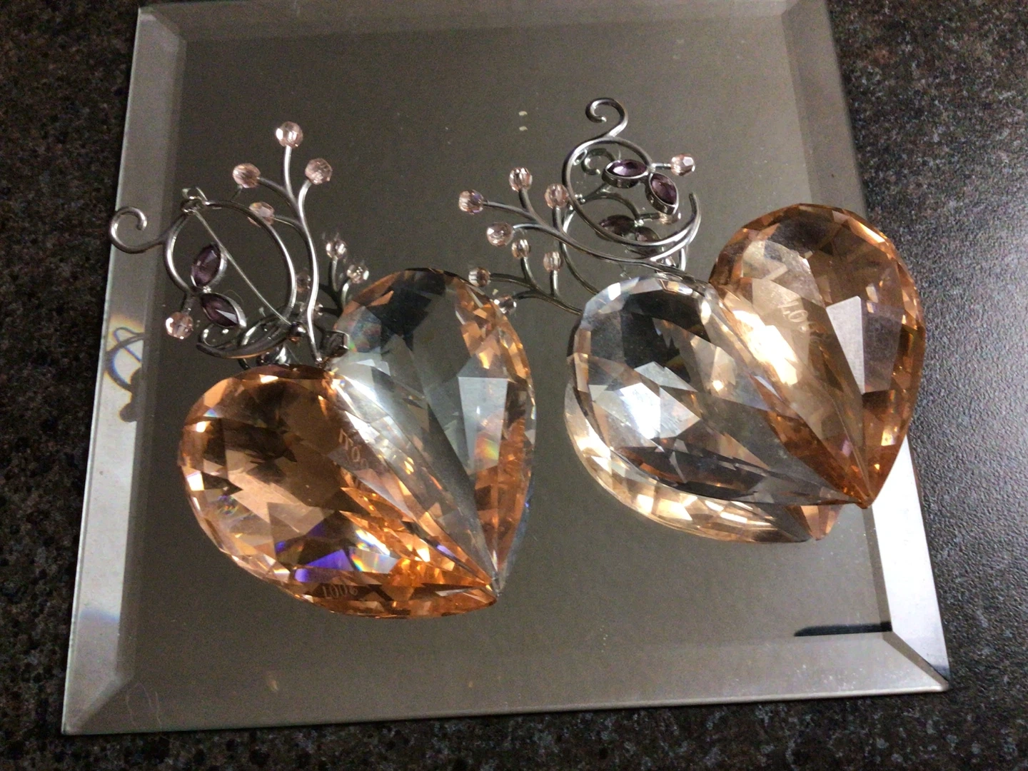 These are a pair of crystal heart figurines. One side is clear and the other is a light amber colour. They have decorative metal accents$80 each