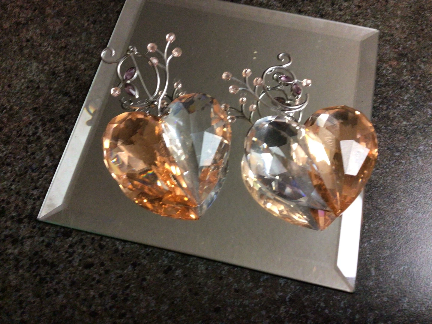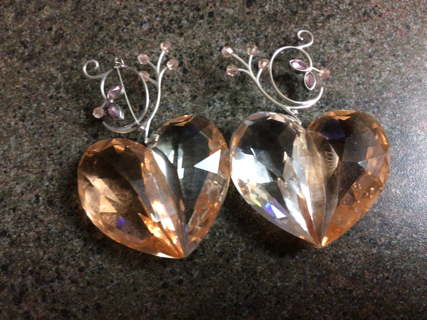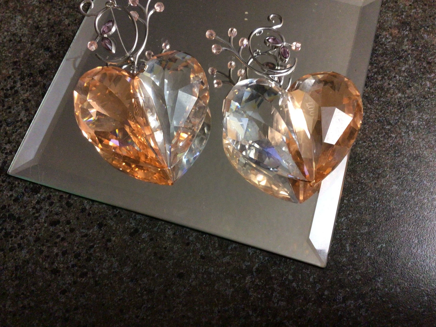 These are a pair of crystal heart figurines. One side is clear and the other is a light amber colour. They have decorative metal accents$80 each