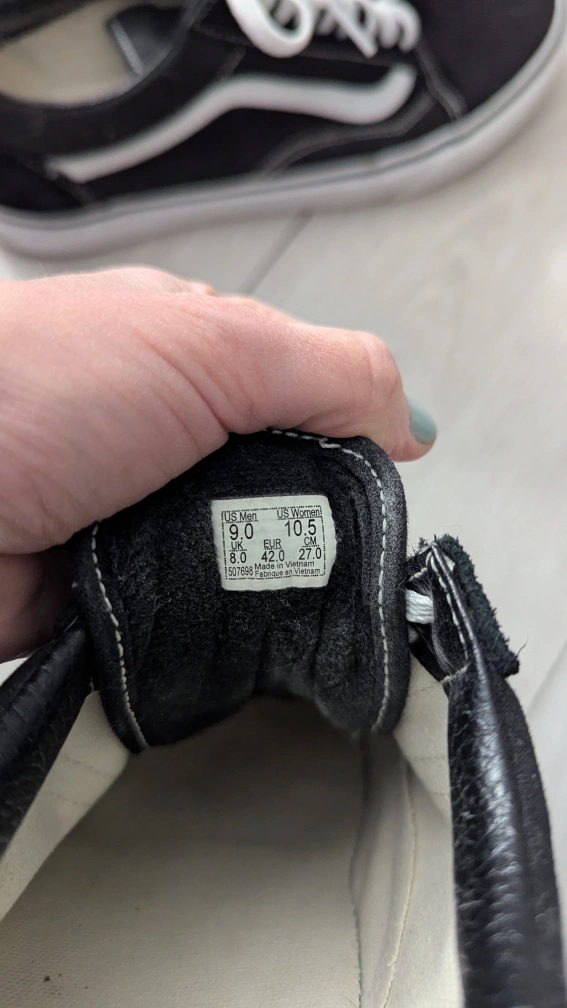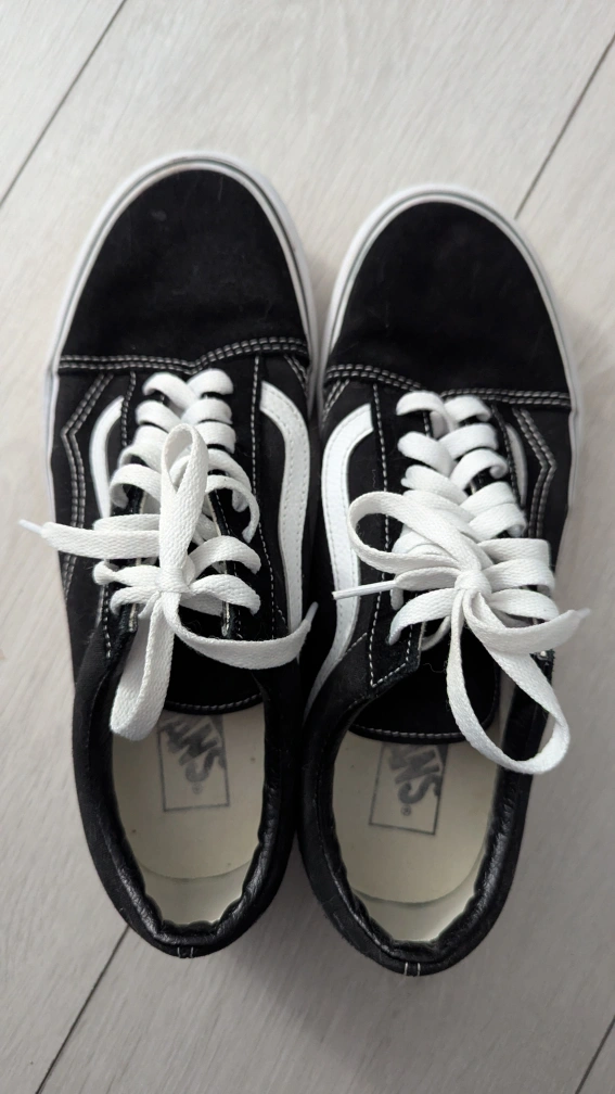 Selling a pair of Vans Old Skool sneakers in black and white. They're in good used condition and are a men's size 9 (US). Classic and versatile style!