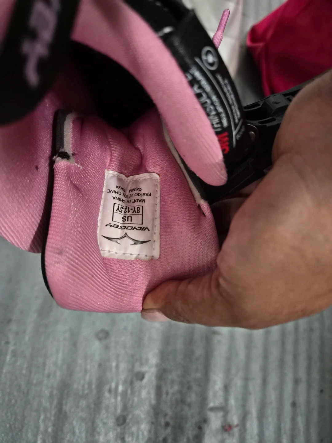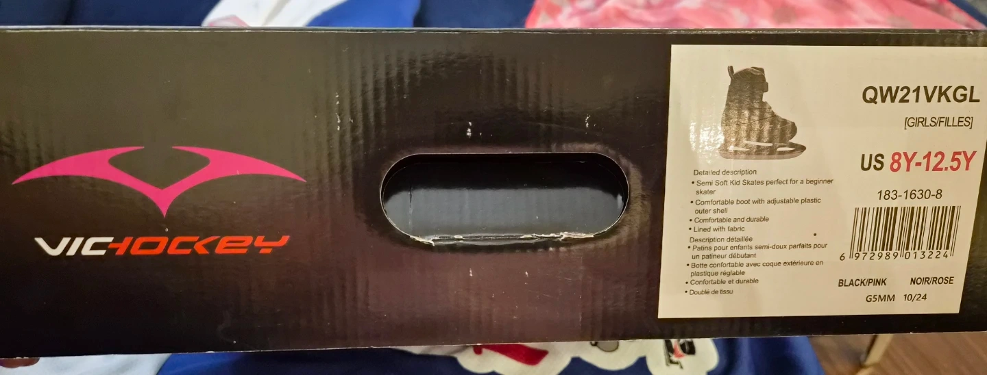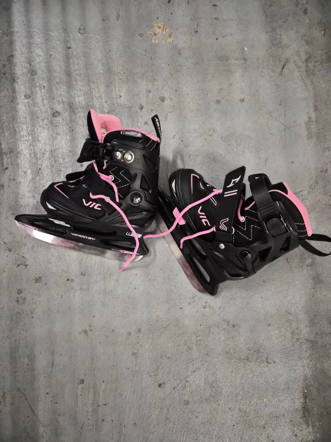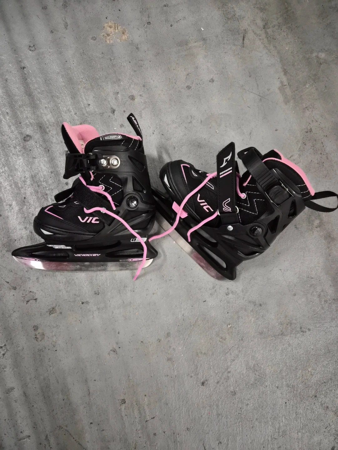 Selling a pair of Vic Hockey girl's skates. They are black and pink and size US 8Y-12.5Y. The skates come in the original box and are semi-soft kid skates perfect for a beginner skater. They are comfortable and durable and lined with fabric