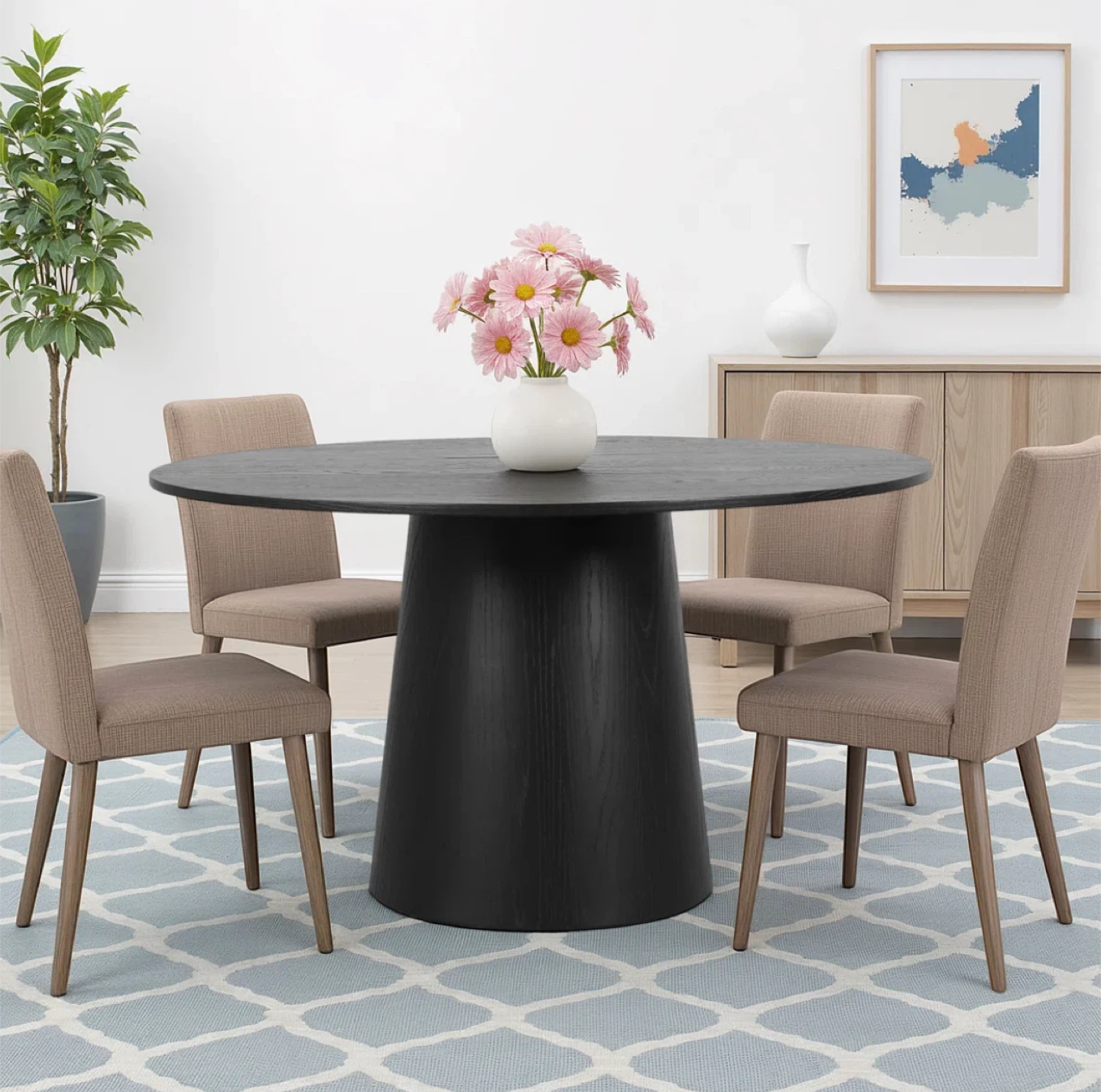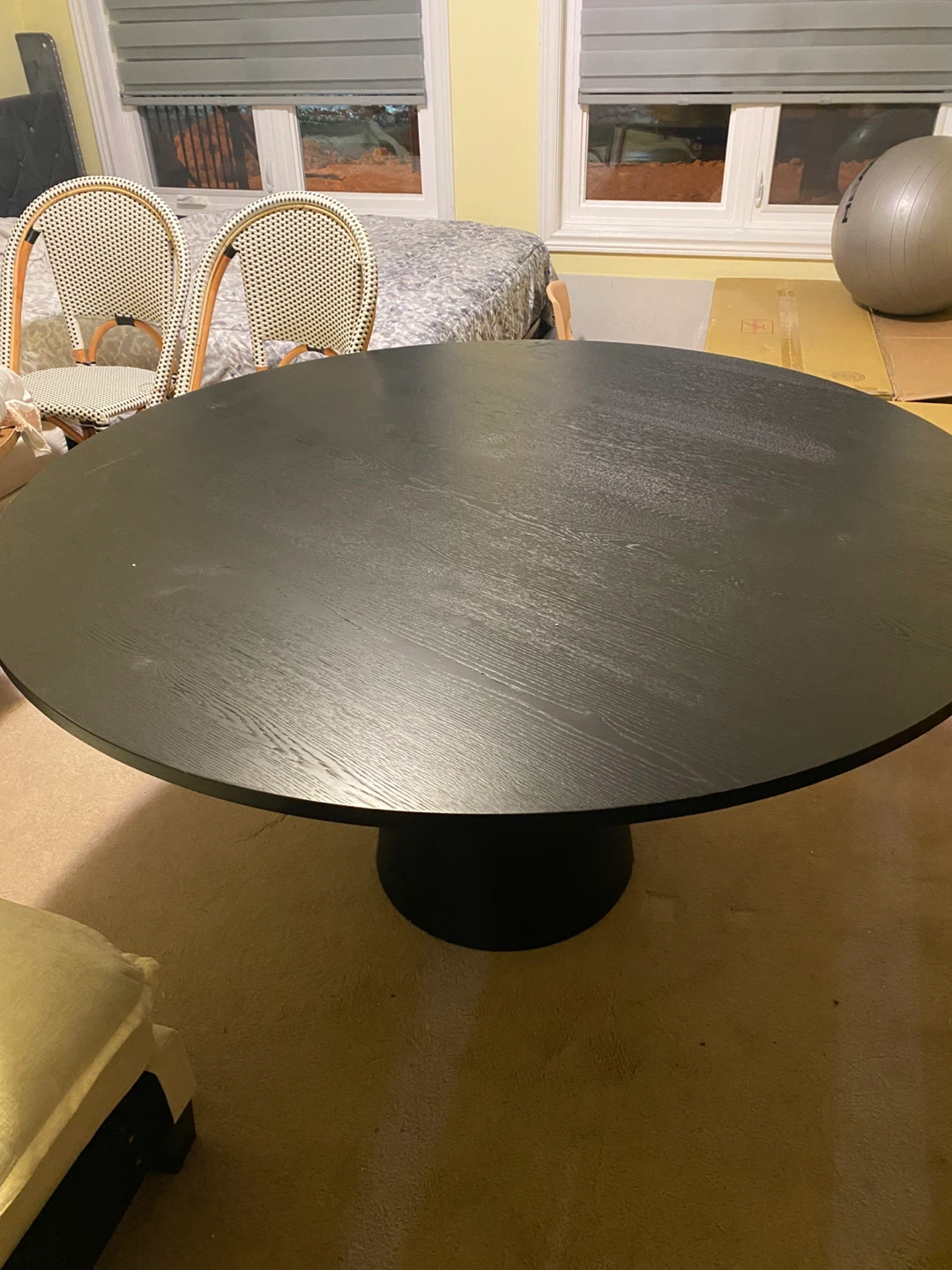Selling a Wade Logan Dysis 52" Solid Oak Round Pedestal Dining Table. The table has a black finish and is 52 inches in diameter and 29.5 inches in height.