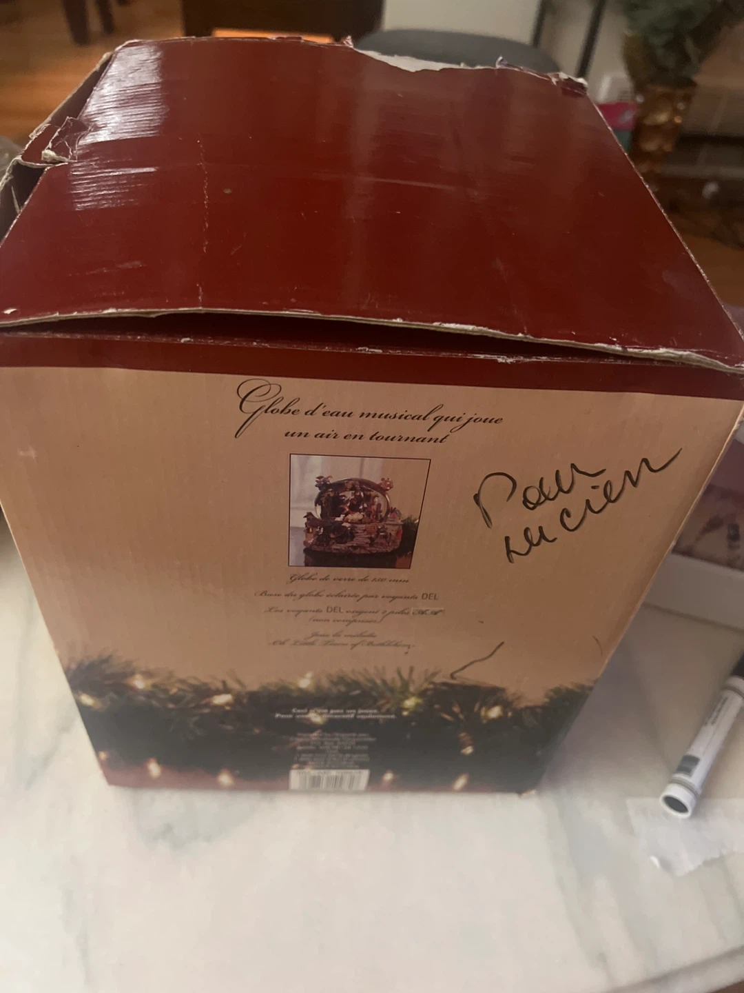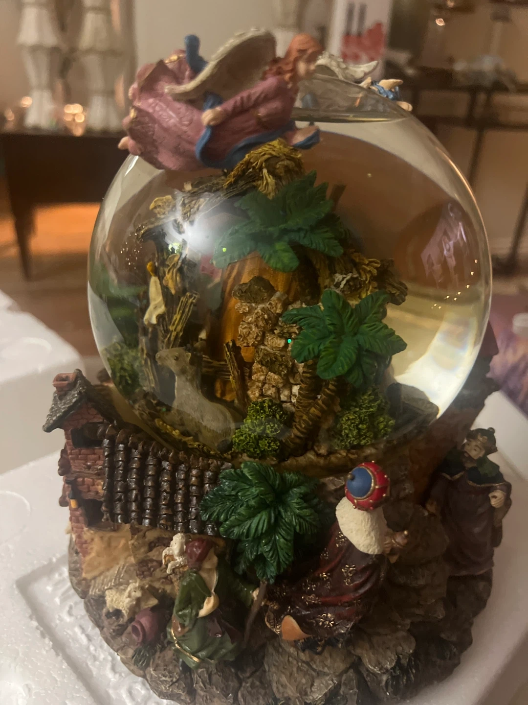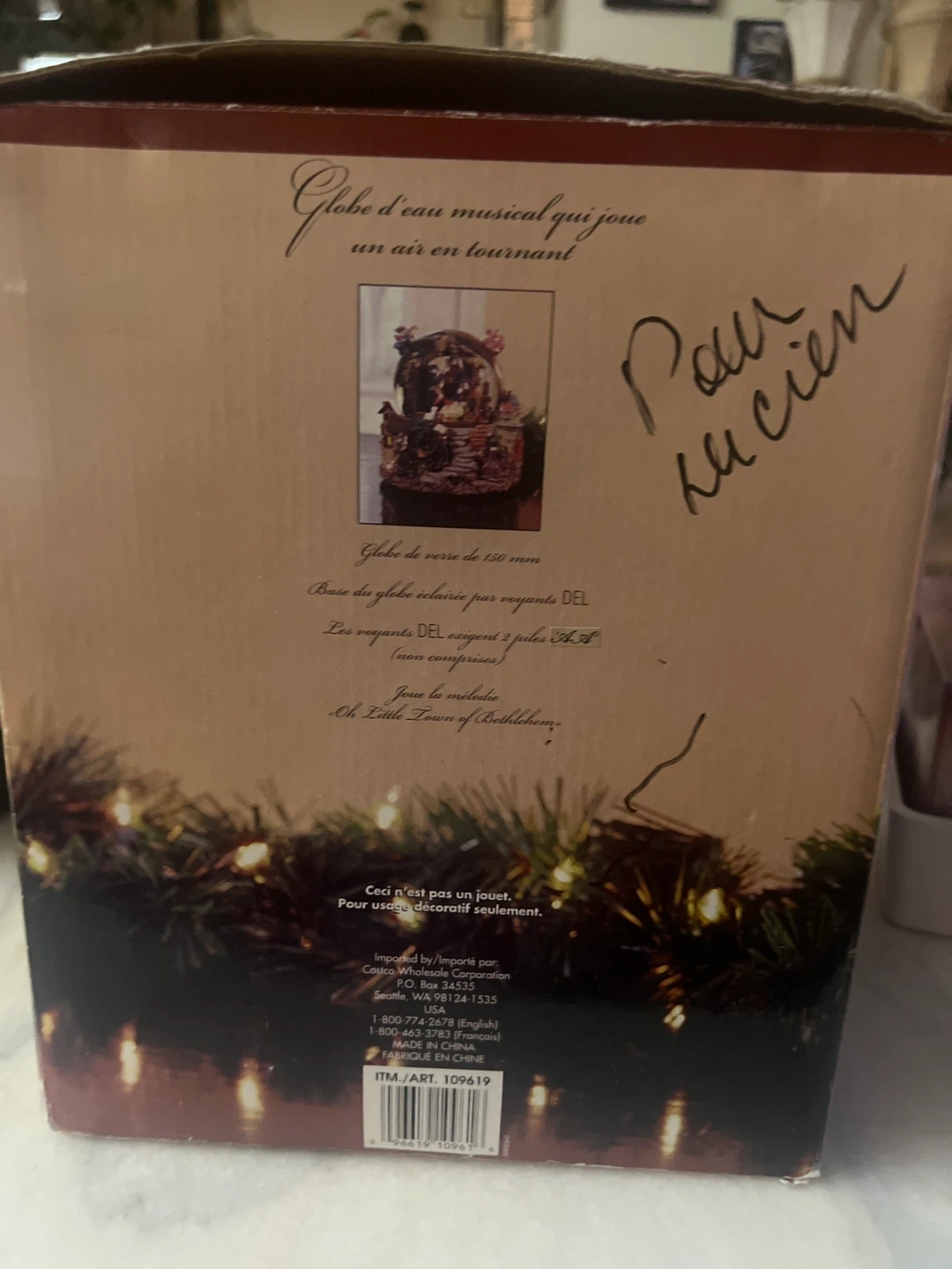Selling a Kirkland Signature musical water globe. It plays "Oh Little Town of Bethlehem" and features a rotating air current inside the globe. The globe itself is made of 120 mm glass. Comes in the original box