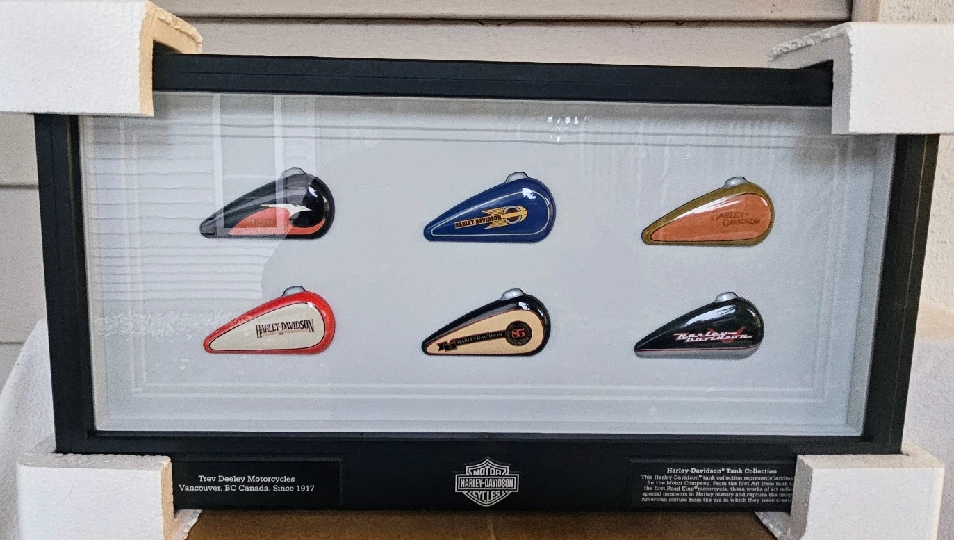 This Harley Davidson Collectible Historical Mini Gas Tank Set, from Trev Deeley Motorcycles.