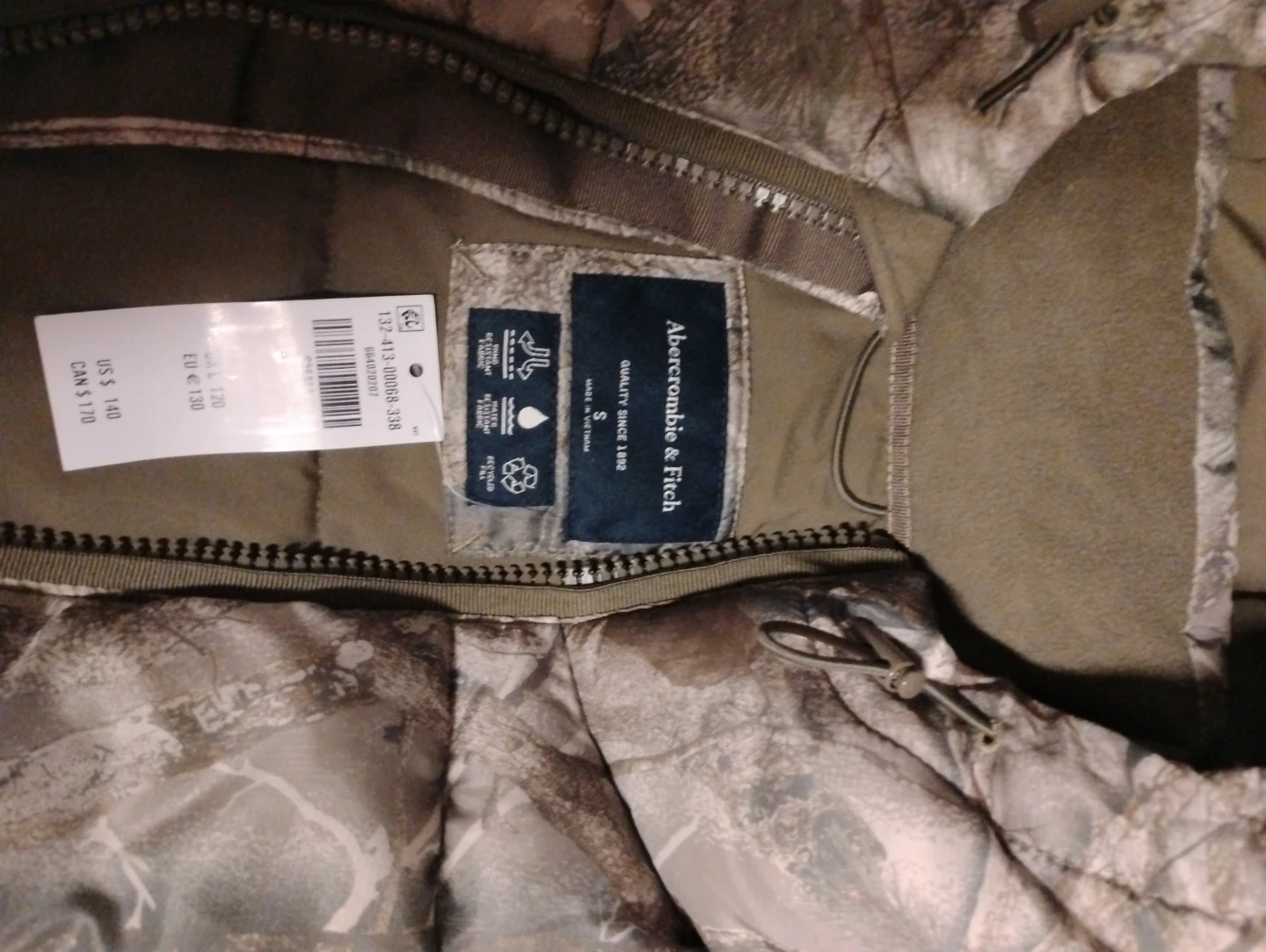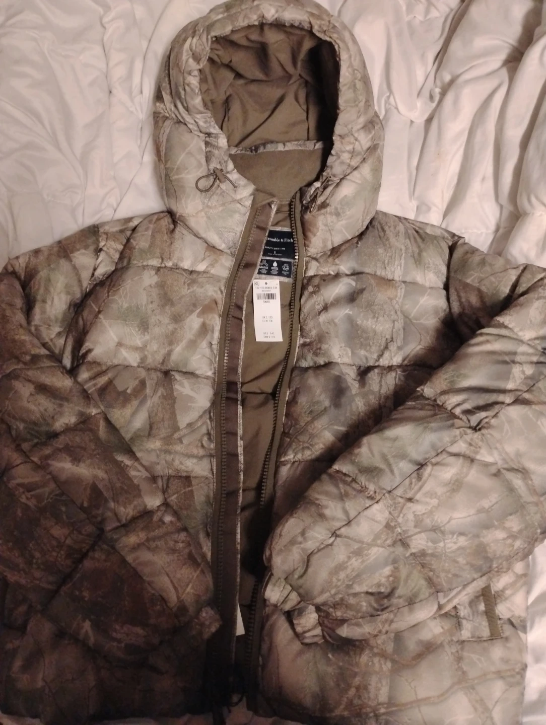 Abercrombie & Fitch puffer jacket in a stylish camo pattern! It's a size small and looks great. The tag shows the original price was around $170 CAD. Perfect for staying warm this winter!