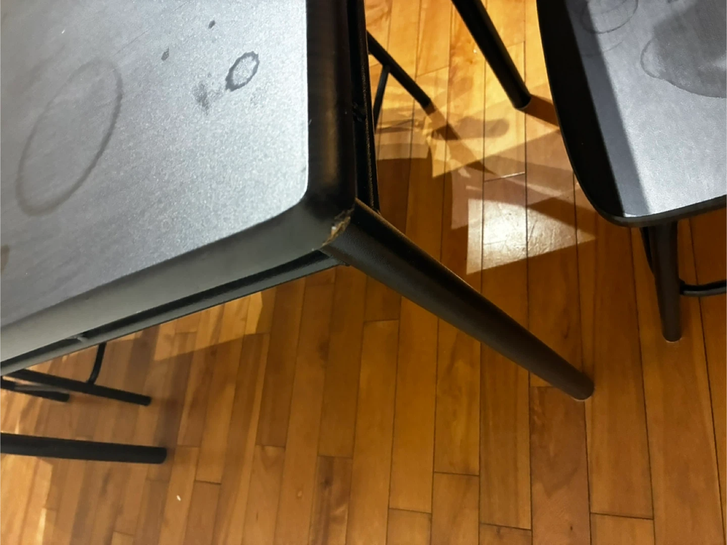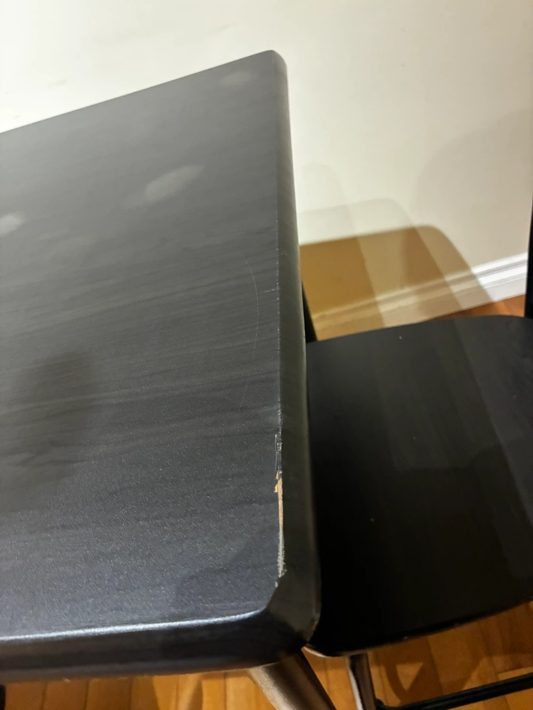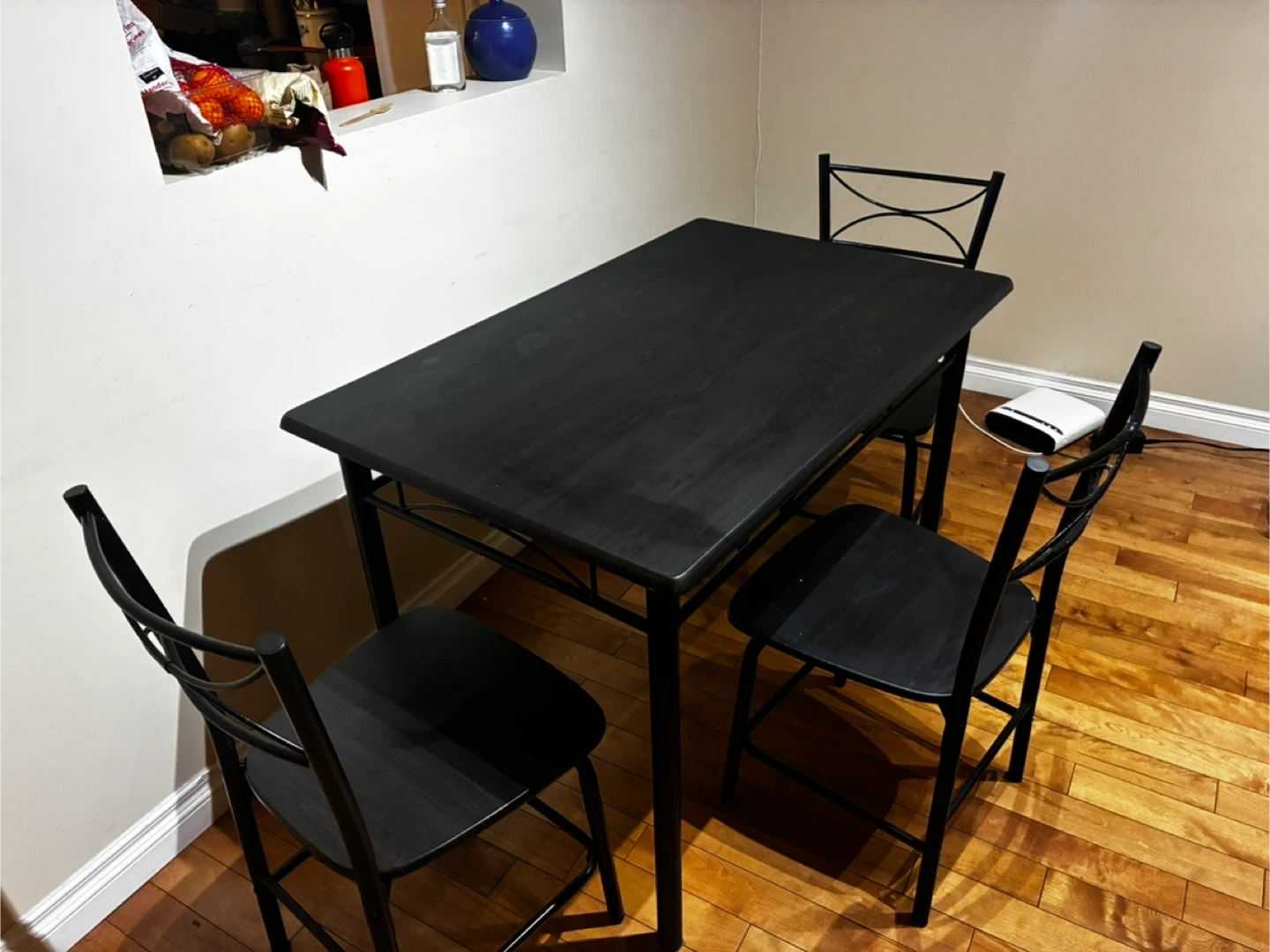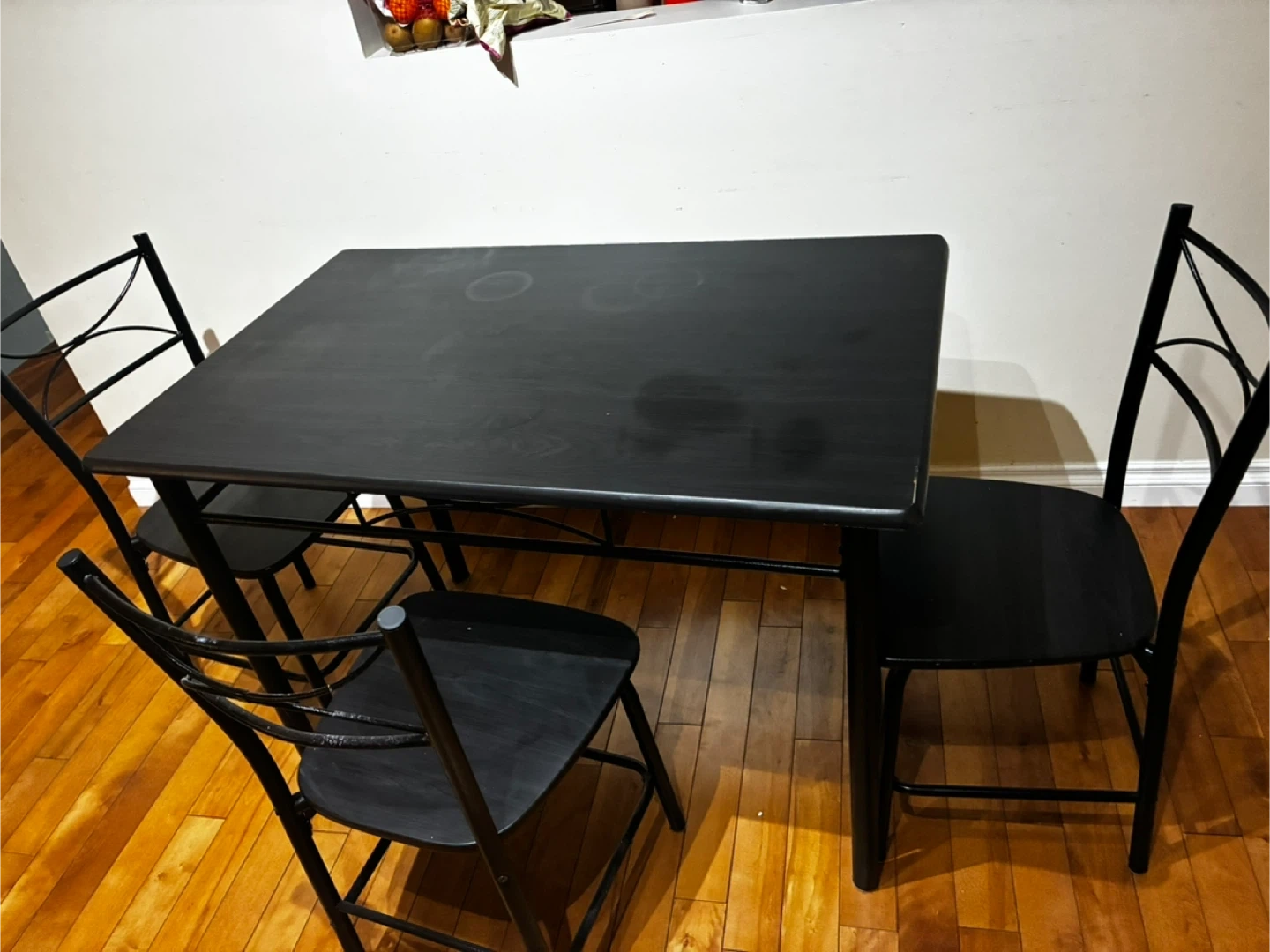 Selling a black dining table with three chairs. There are some minor scratches and wear on the table's edges. Please see the photos for details!