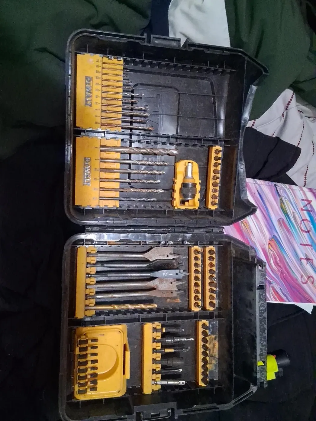 Selling a DeWalt drill bit set. It comes in a black case with yellow inserts to hold the drill bits. The set includes a variety of drill bits and accessories. Some of the bits show signs of use.