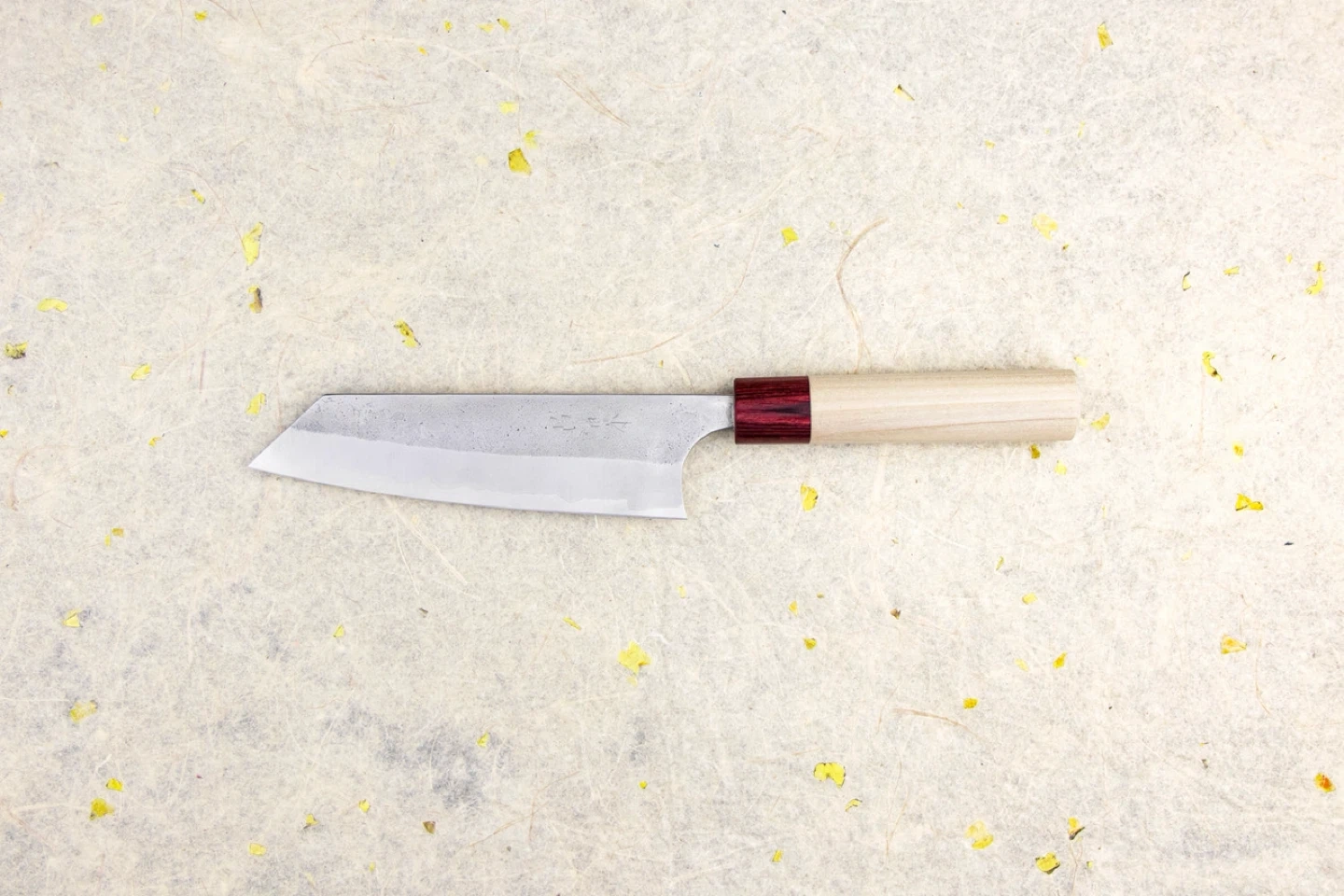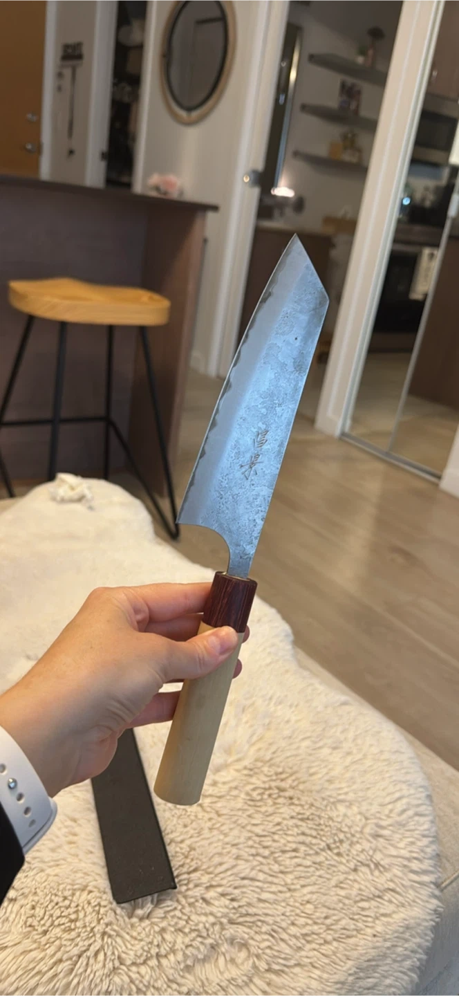 Cuts like a dream. As with all Shirogami carbon-steel knives, the exposed edge can develop a bit of patina or tiny surface rust—this one has a small discoloration spot that’s purely cosmetic and can be polished out with baking soda or a rust eraser. Does not affect performance at all.