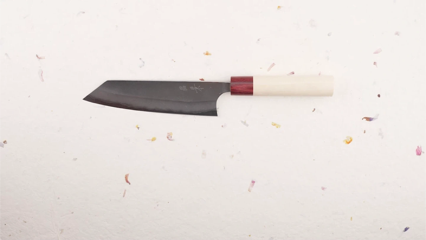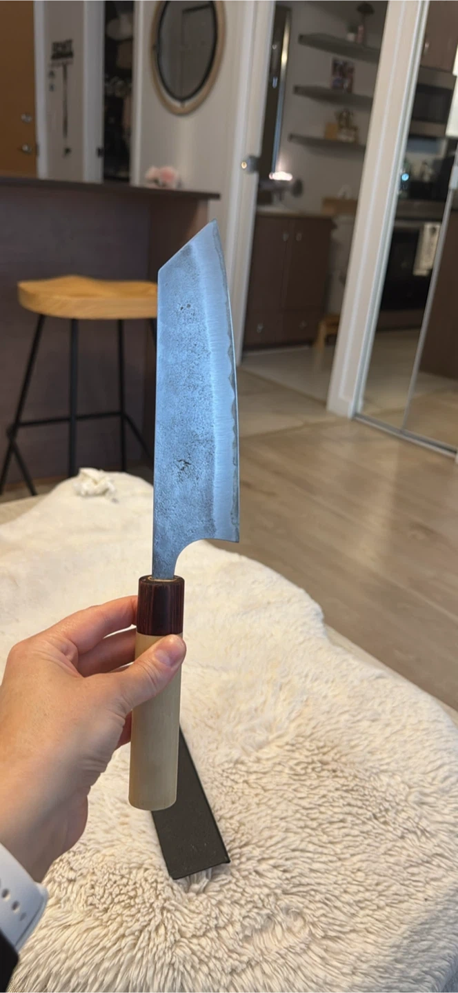 Cuts like a dream. As with all Shirogami carbon-steel knives, the exposed edge can develop a bit of patina or tiny surface rust—this one has a small discoloration spot that’s purely cosmetic and can be polished out with baking soda or a rust eraser. Does not affect performance at all.