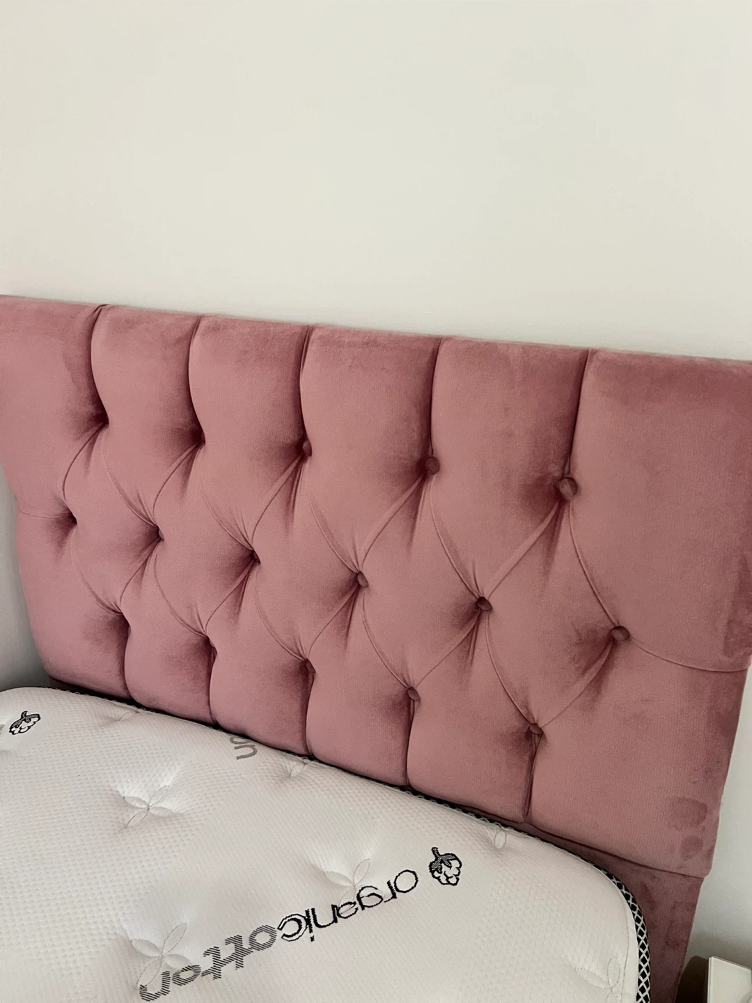 Selling a single bed with a lovely pink headboard. It's in great condition and would look perfect in any bedroom! The mattress is an Organic Cotton brand.