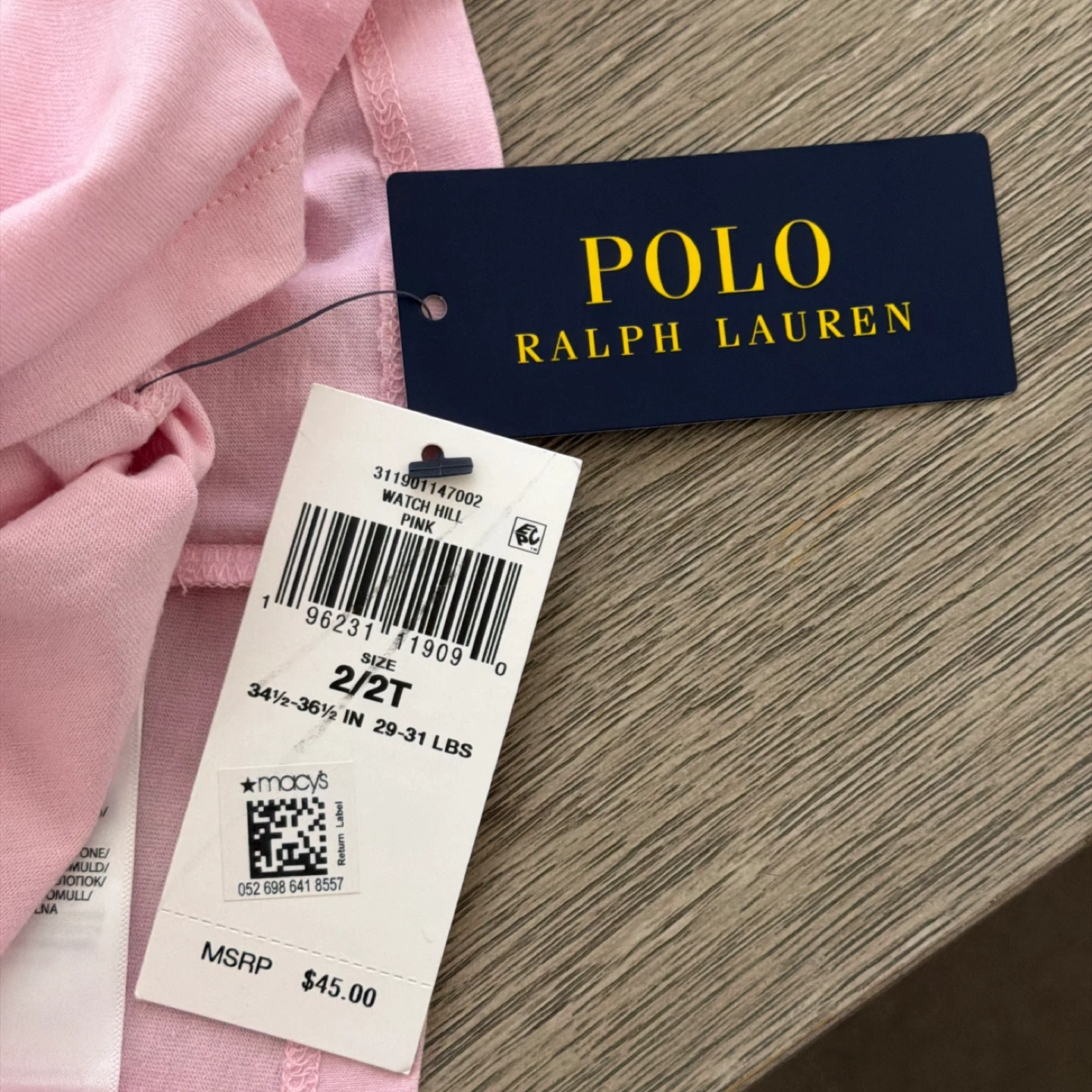 Here's a brand new POLO Ralph Lauren pink t-shirt! It's size 2/2T and features the POLO logo in a colorful pattern. The tag shows it was originally bought for $45. Perfect for your little one!