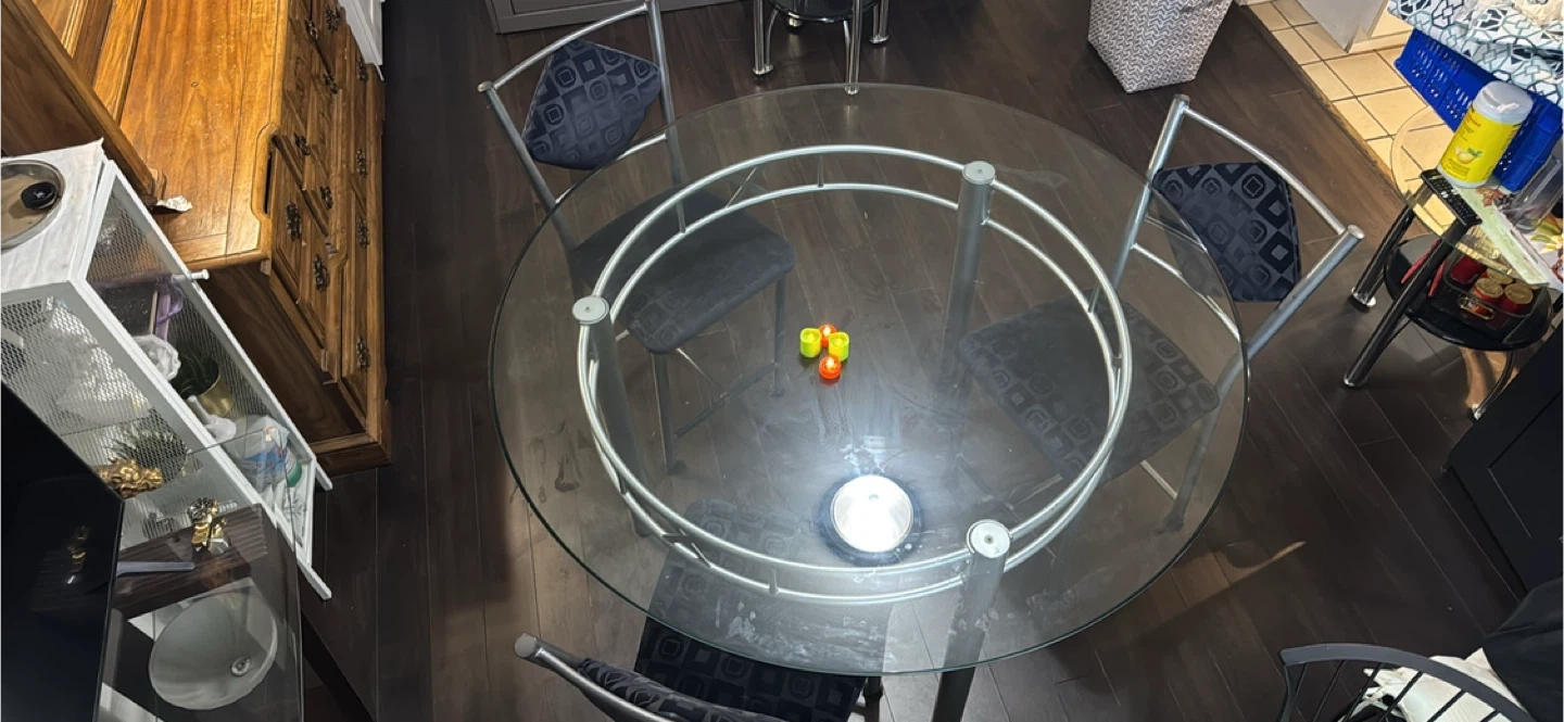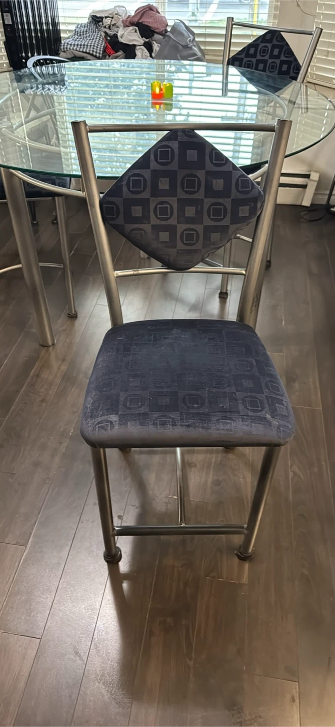 Selling a glass dining table that comes with chairs. The chairs have a unique patterned design on the back and seat. It's a great set for a smaller dining space!