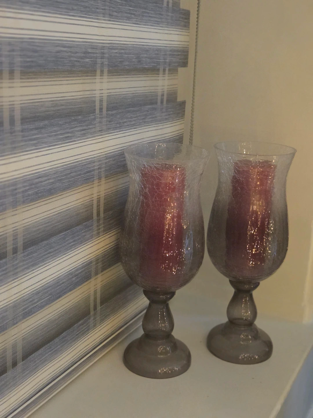 Selling a set of two glass candle holders. They have a crackled glass effect and a pedestal base. They are in great condition and would look lovely in any home