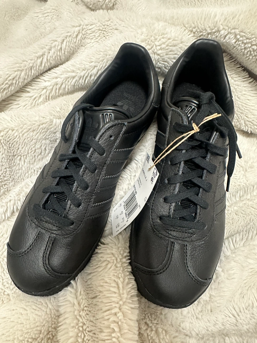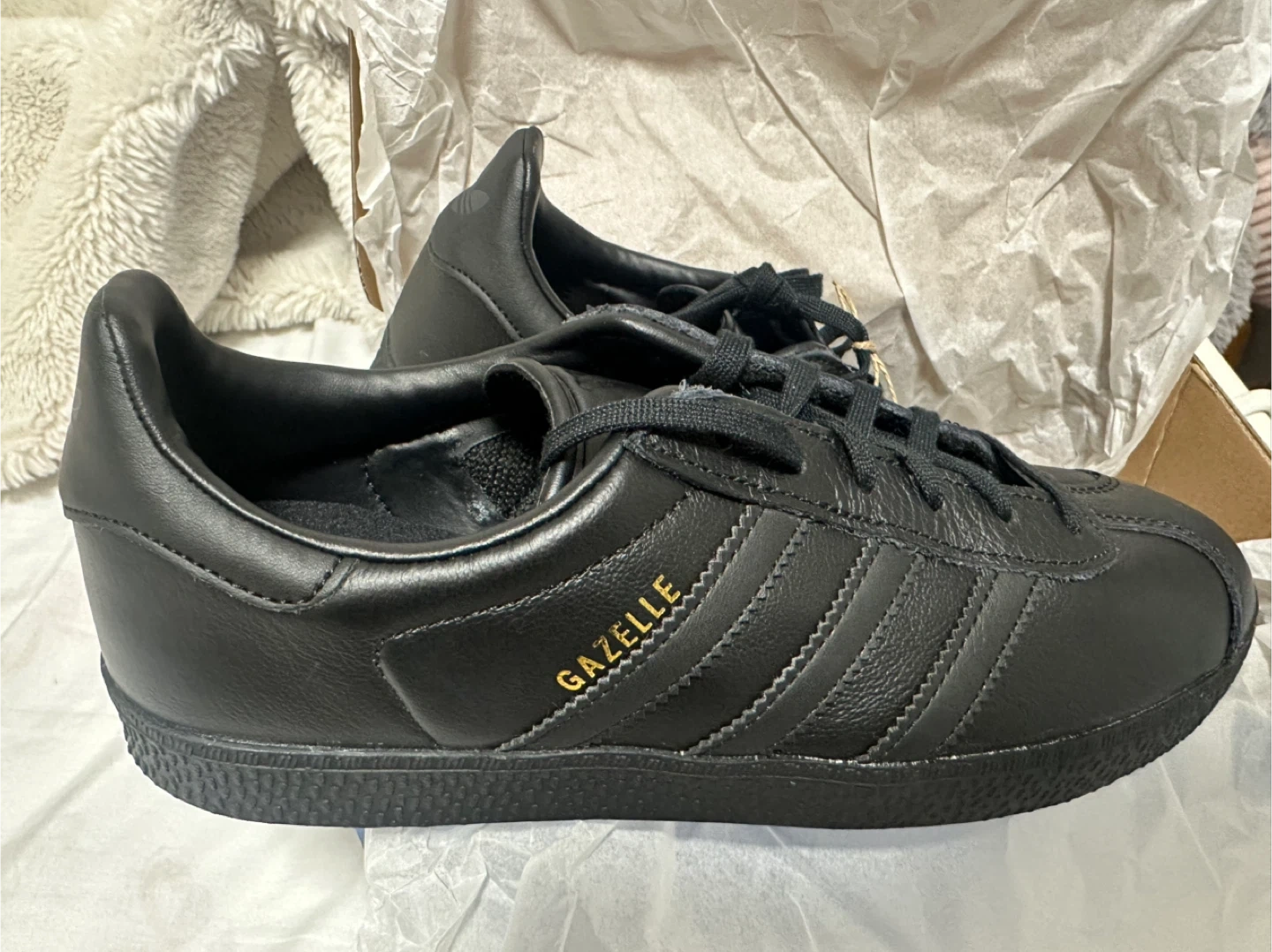 Selling a pair of Adidas Gazelle leather shoes in black, size 4.5 to 5.0. These classic sneakers are in great condition and ready for a new owner. The leather material provides a sleek and stylish look, perfect for everyday wear. Don't miss out on these iconic shoes!
