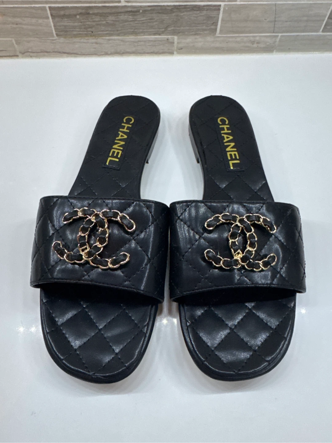 Selling a pair of Chanel sandals in black leather. They are in good condition and are a size 39. Perfect for a casual day out or dressing up for an evening event!
