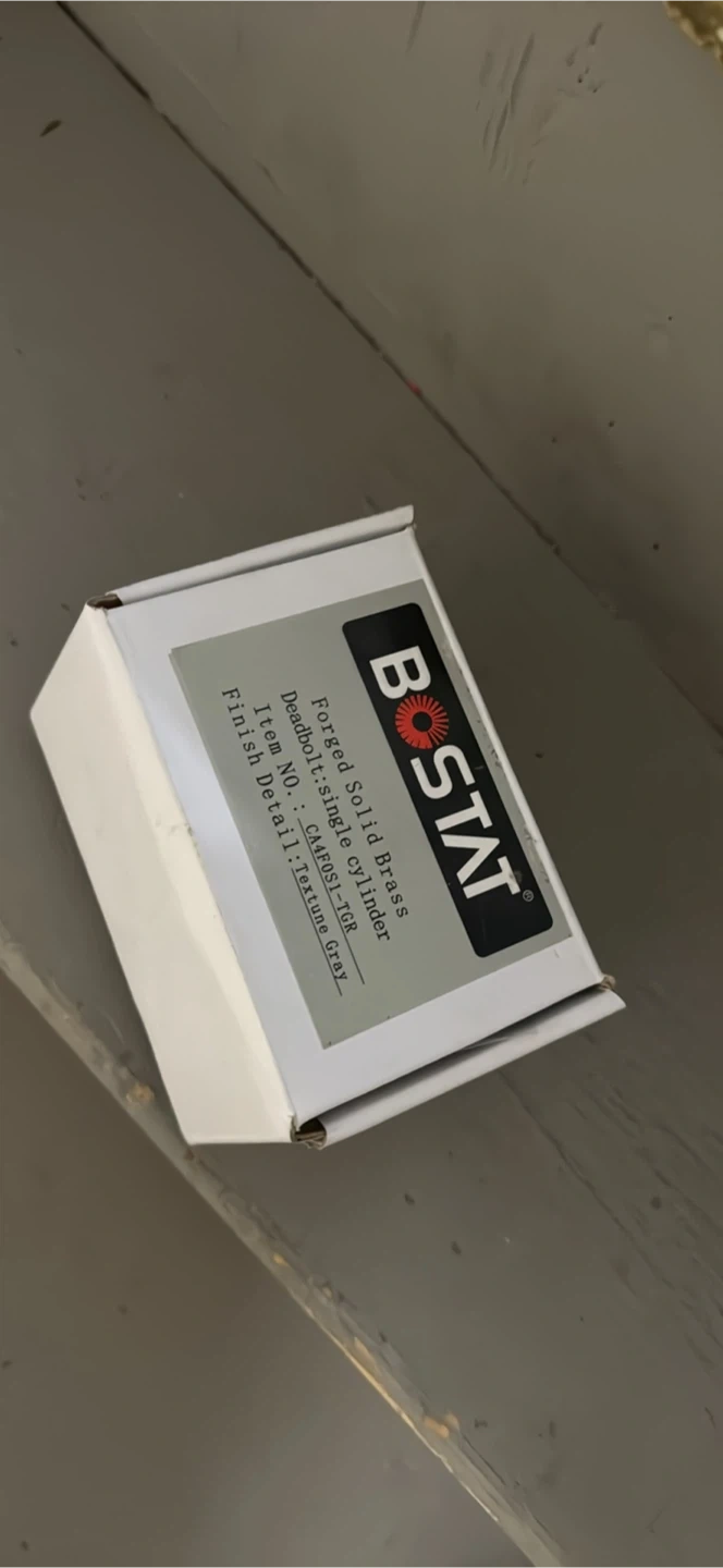 Selling a brand new BOSTAT forged solid brass deadbolt in its original box! It's a single cylinder deadbolt with a textured gray finish.
