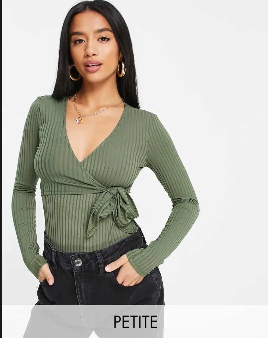 This ASOS Design Petite wrap bodysuit comes in a lovely olive green colour. It features a flattering wrap design with long sleeves. It's perfect for layering or wearing on its own!