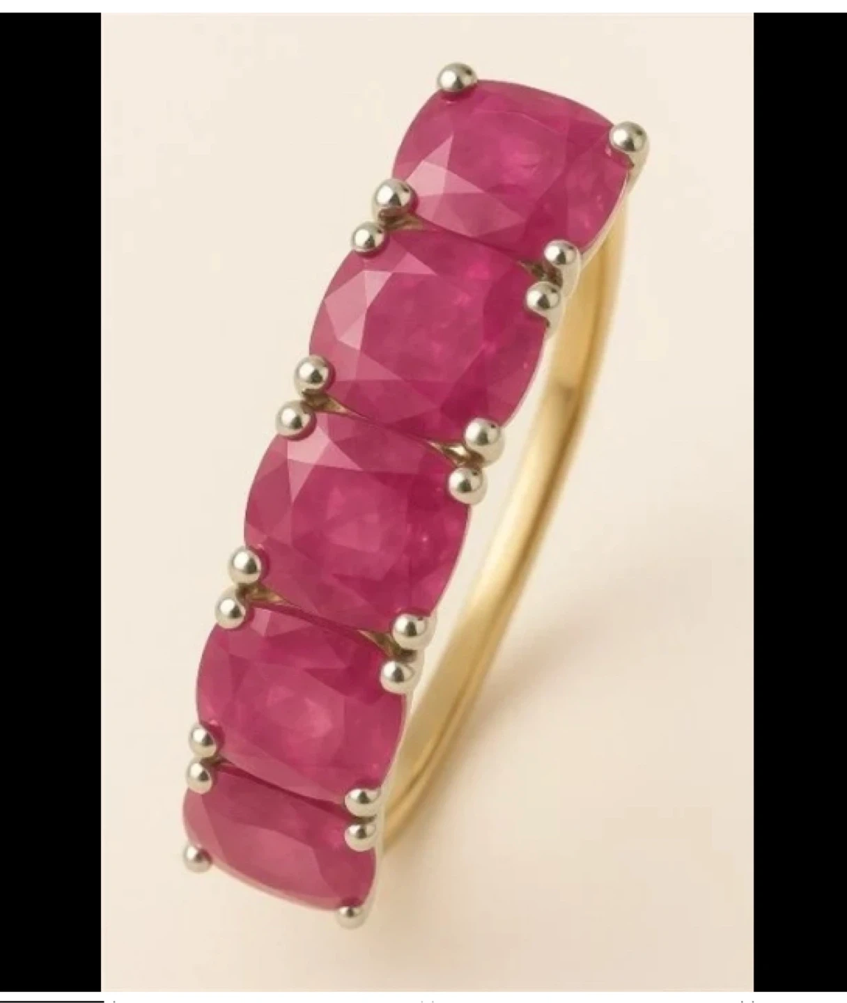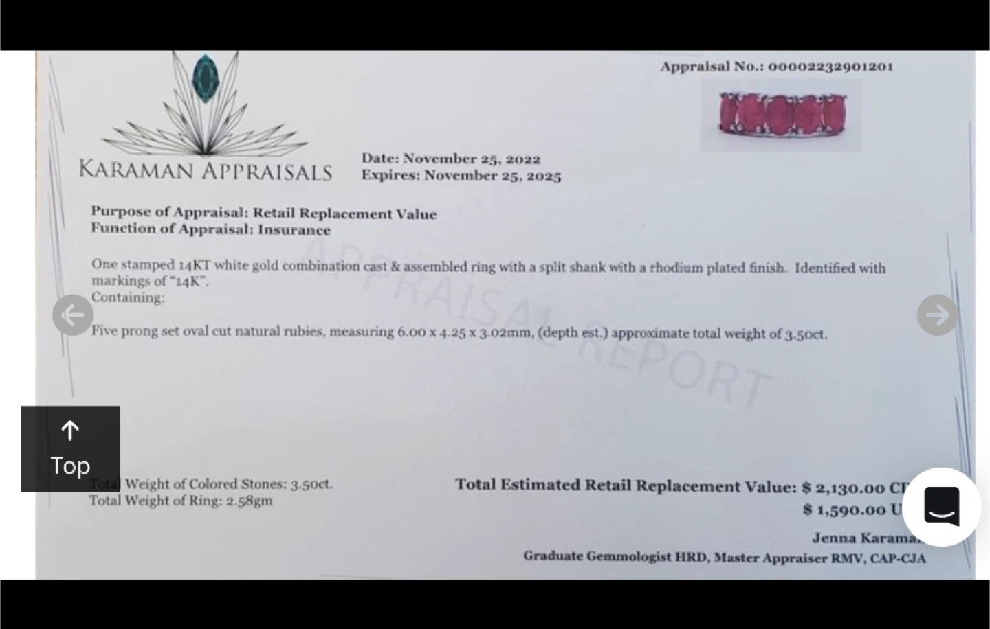 Selling a beautiful, new 14KT white gold ring with natural rubies. The ring features five prong-set oval cut rubies, each measuring approximately 6.00 x 4.25 x 3.02mm. The total weight of the ring is 2.58gm, with a total colored stone weight of 3.50ct. The appraisal report is included and lists the retail replacement value at $2,130.00 CAD. With similar items here selling for $950 to $1,100, it’s priced to sell. #1407