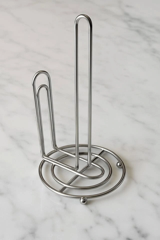 This sleek stainless steel holder fits any standard roll, stands solid on its weighted base, and has an easy-tear side guide so you don’t yank half the roll off by accident.