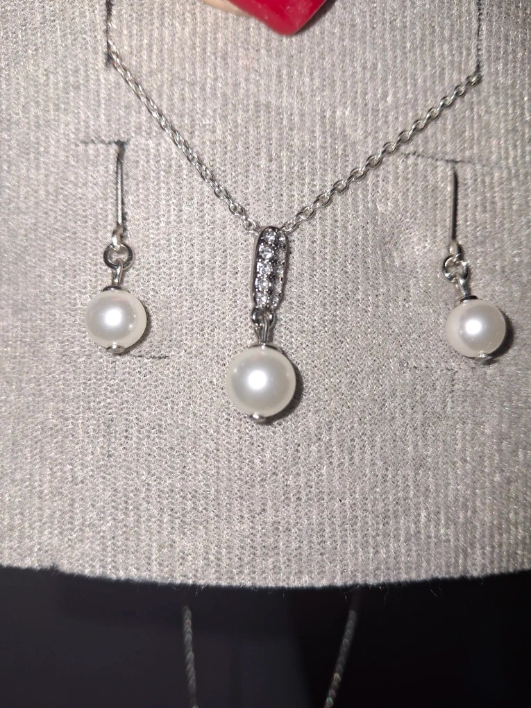 Selling a beautiful pearl necklace and earrings set. The necklace features a delicate chain with a pearl pendant, complemented by matching pearl earrings. This set is perfect for adding a touch of elegance to any outfit!