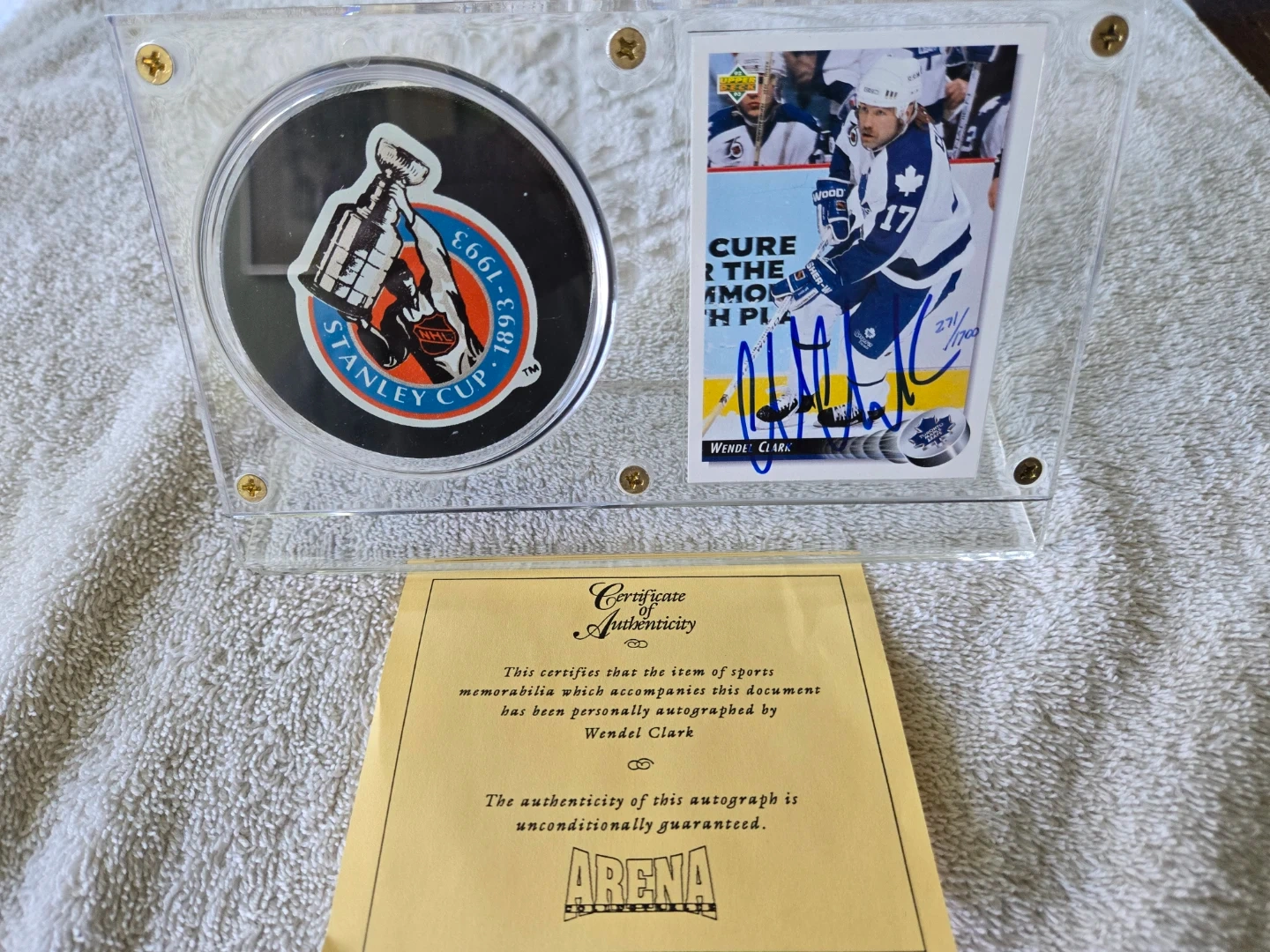 Selling Autographed Wendel Clark, Authentic, Limited Edition (271 of 1700) Card with Official Game Puck. Includes certificate of authenticity and is in its original crystal clear display holder.