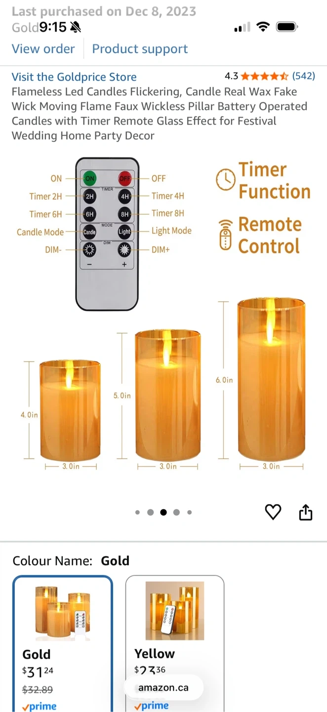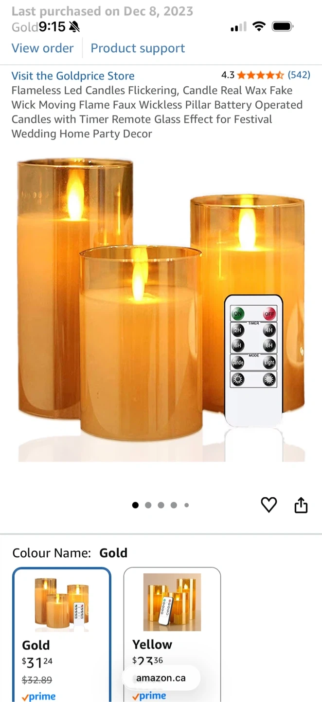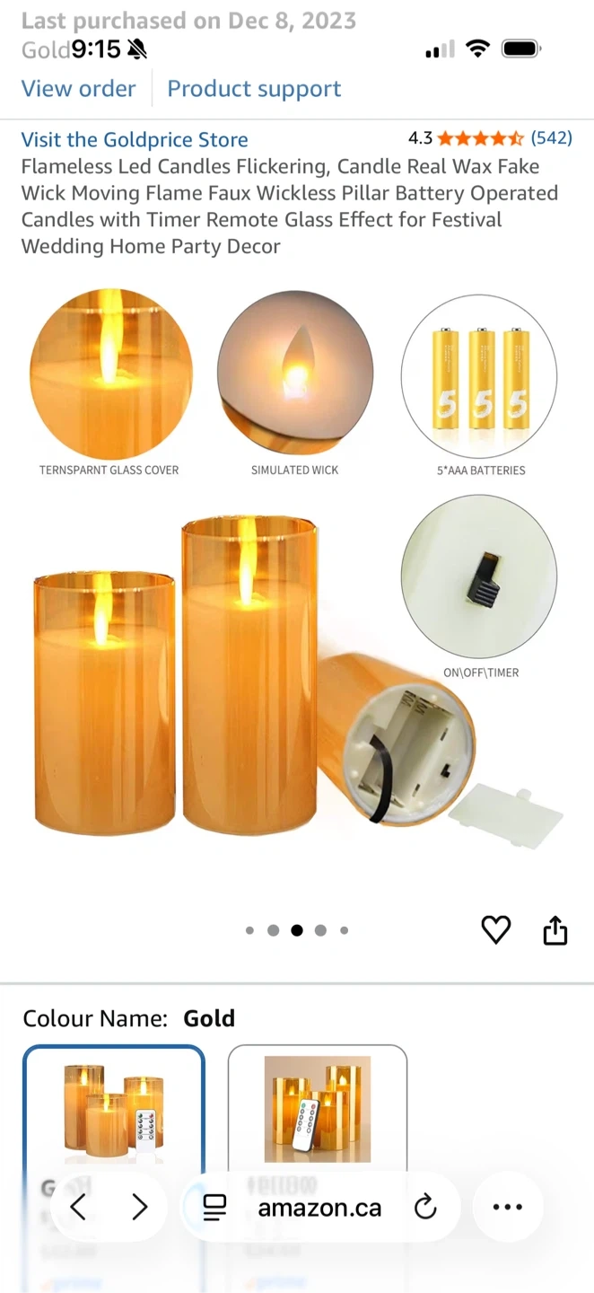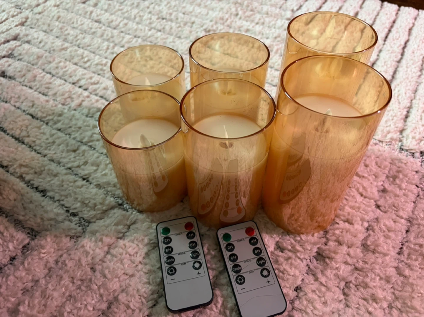 Selling a set of six flameless LED candles that flicker like real candles. They are battery operated and come with a remote control. The set includes 2x of each size to create a warm ambiance for any occasion. Colour is gold.