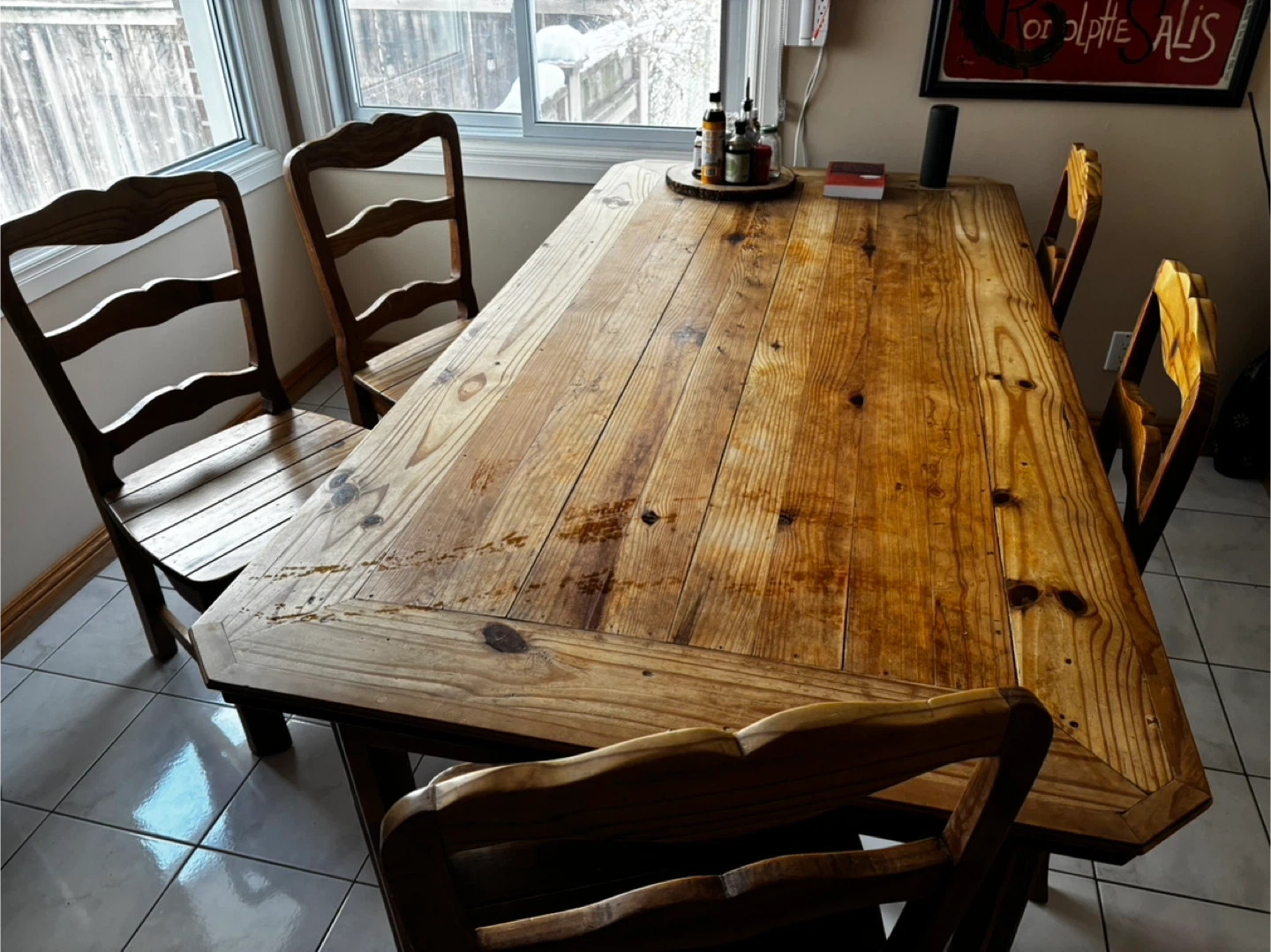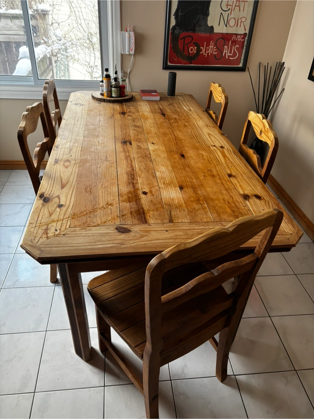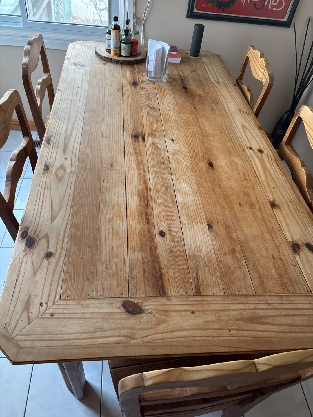 Solid (one piece) thick pine dining table that comes with 6 matching chairs. I bought it for my old house and it is too big for the kitchen in my current house. My friend is giving me her round glass table which would fit better here and I want to sell this to finance getting matching chairs. Original price tag was over $3000. I'm hoping to sell it quickly.