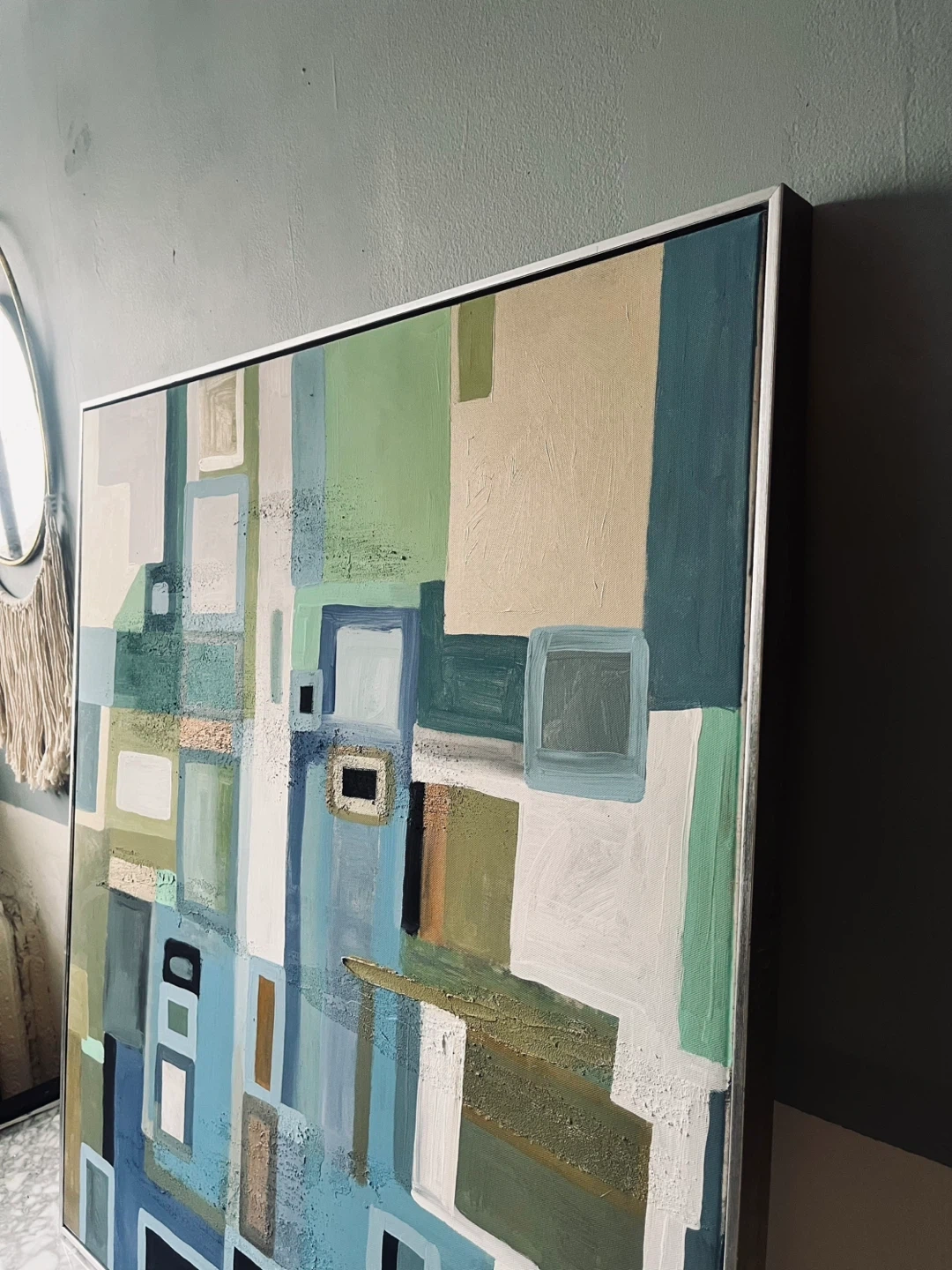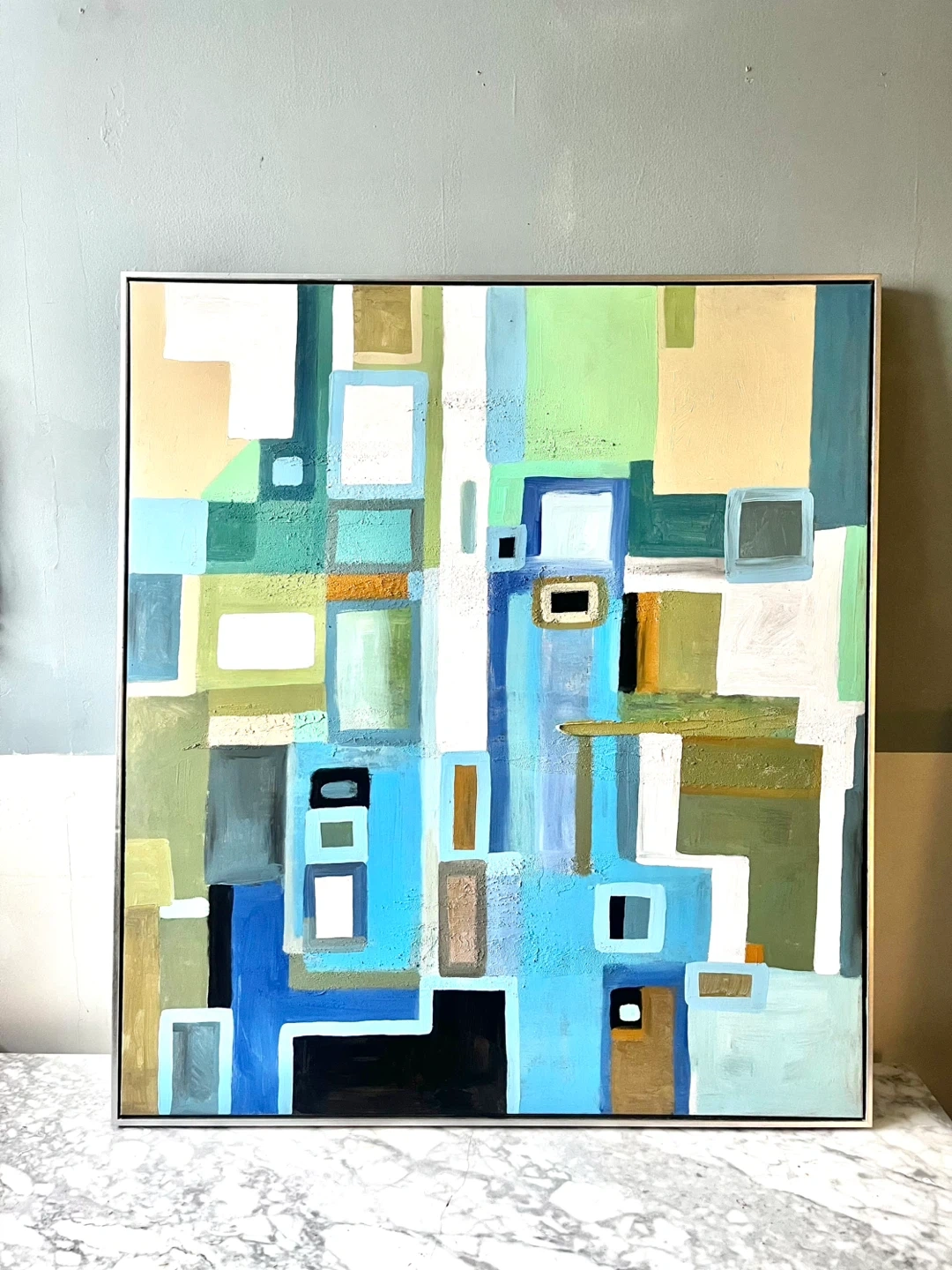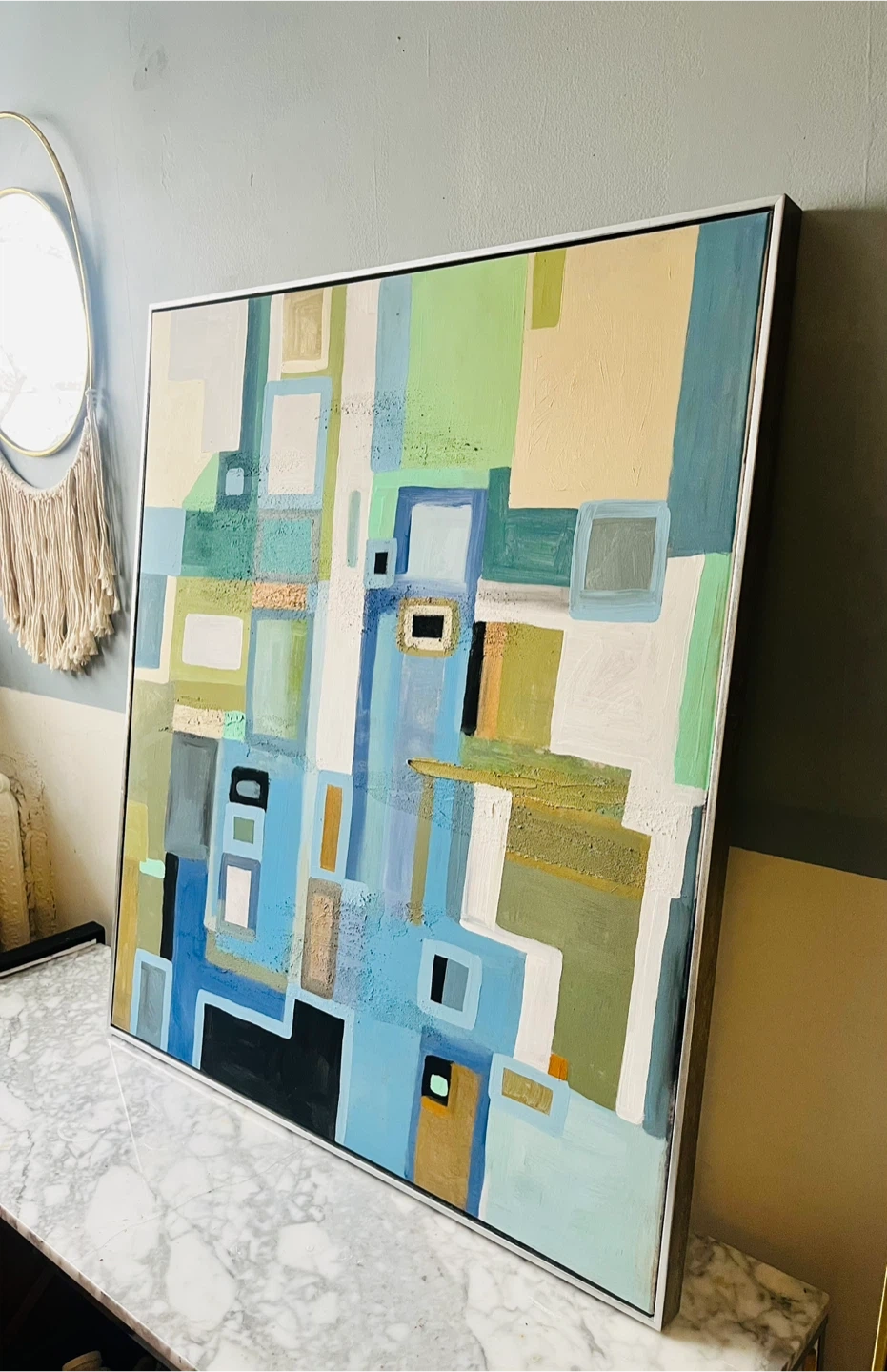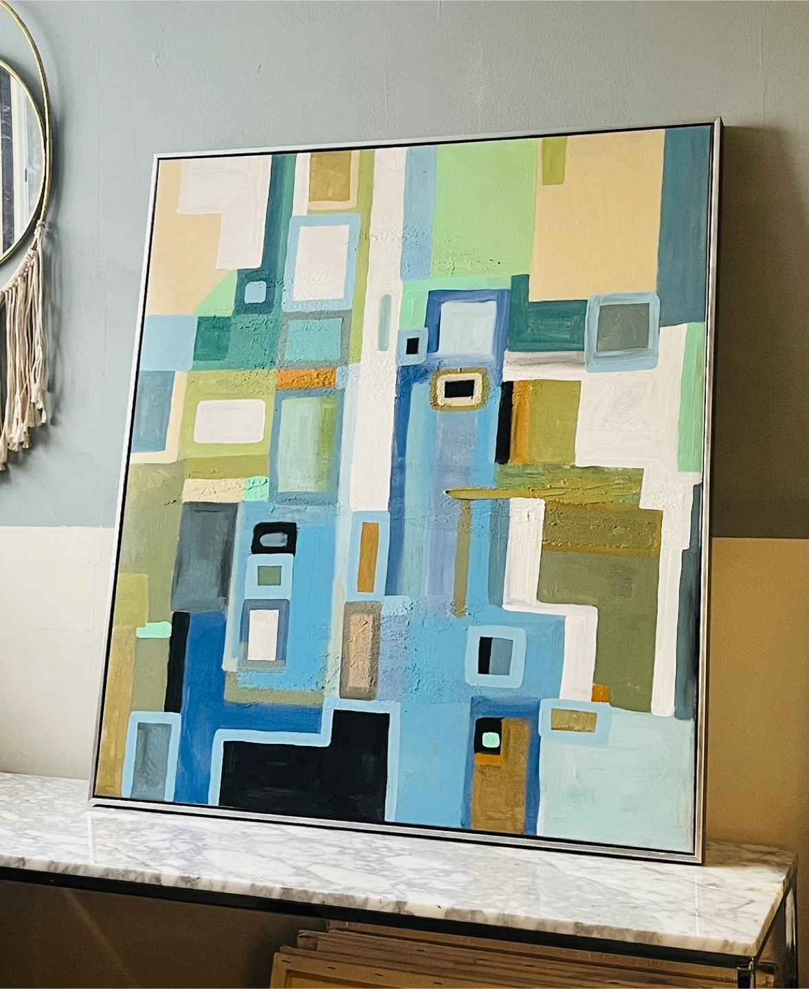 Here's a lovely abstract geometric piece of wall art. It features a mix of blue, green, beige, and brown tones. The painting comes framed and is ready to be hung up in your home! Hand painted this isn’t a print