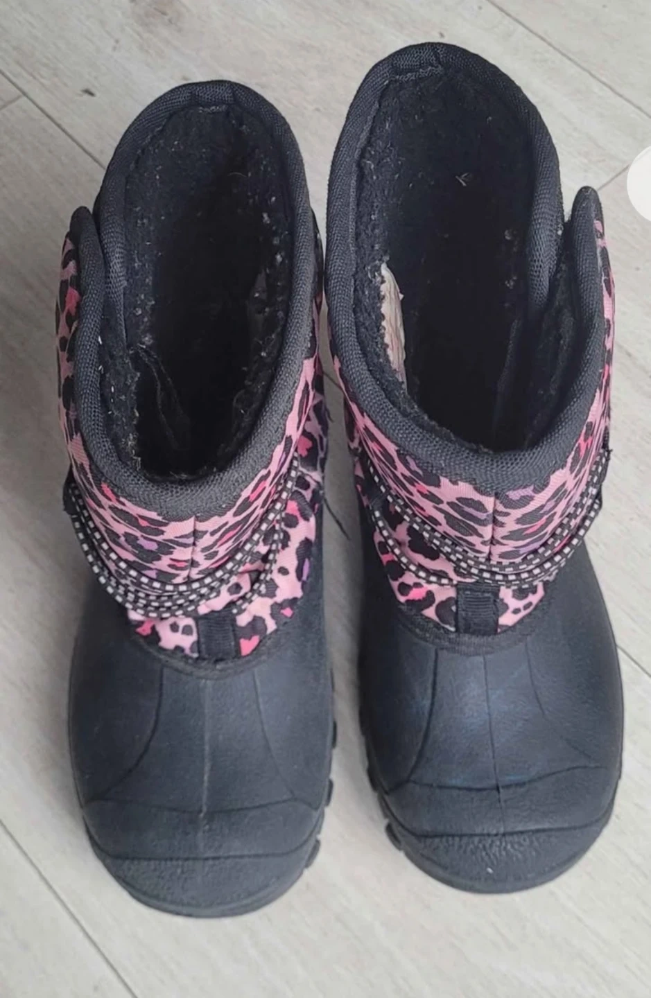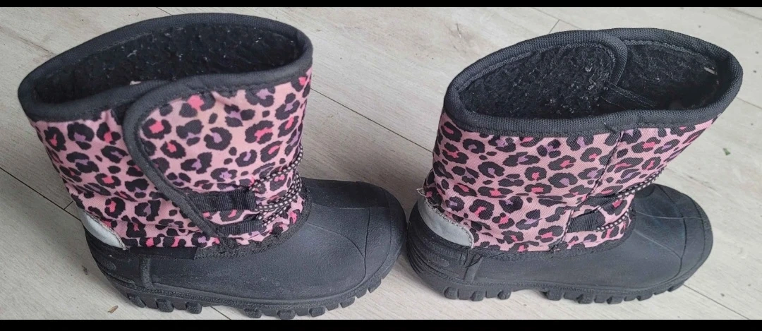 These cute winter boots are perfect for keeping your little one's feet warm and dry! They are black with a fun pink and black leopard print design. Size 10.