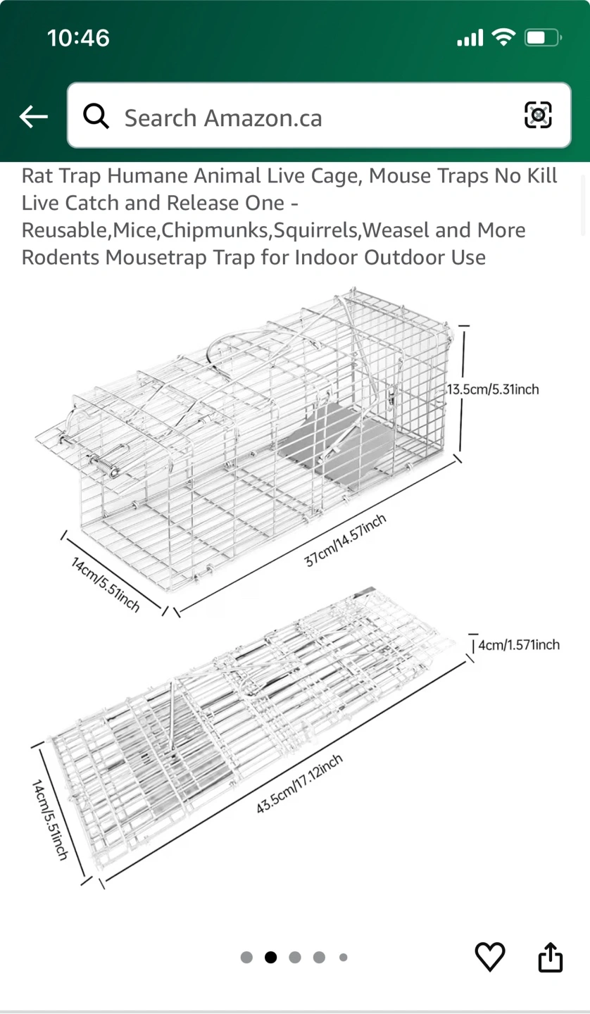 Selling a humane animal live cage, perfect for catching mice, chipmunks, squirrels, weasels, and other rodents. It's reusable and suitable for both indoor and outdoor use. The dimensions are approximately 37cm x 14cm x 13.5cm. Originally bought for $25.59.