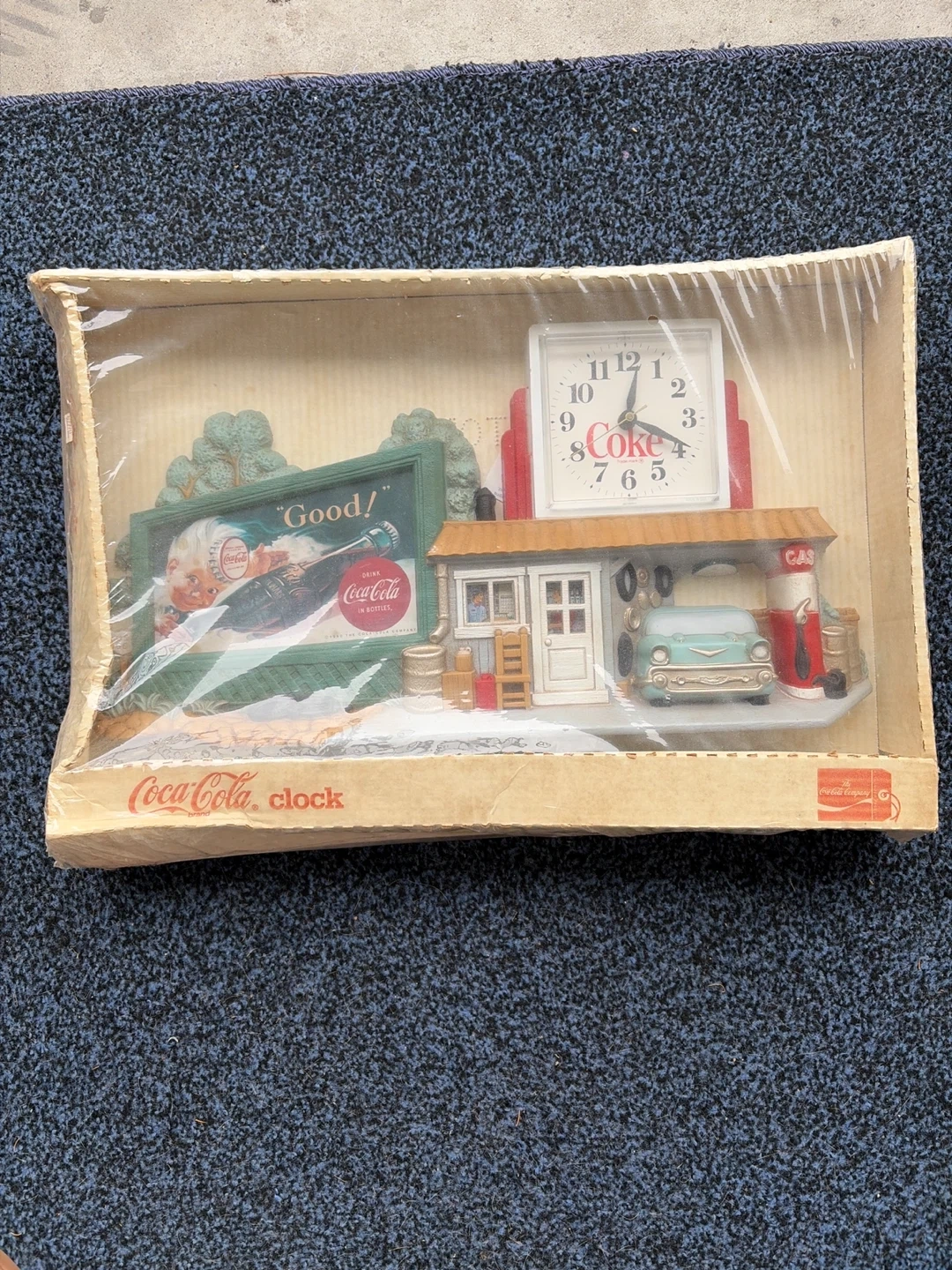 Selling a brand new Coca-Cola clock, still in its original packaging! It features a vintage Coca-Cola design with a gas station theme. A fun collectible piece for any Coca-Cola enthusiast! Box is a little old and dusty, but product is never been used
