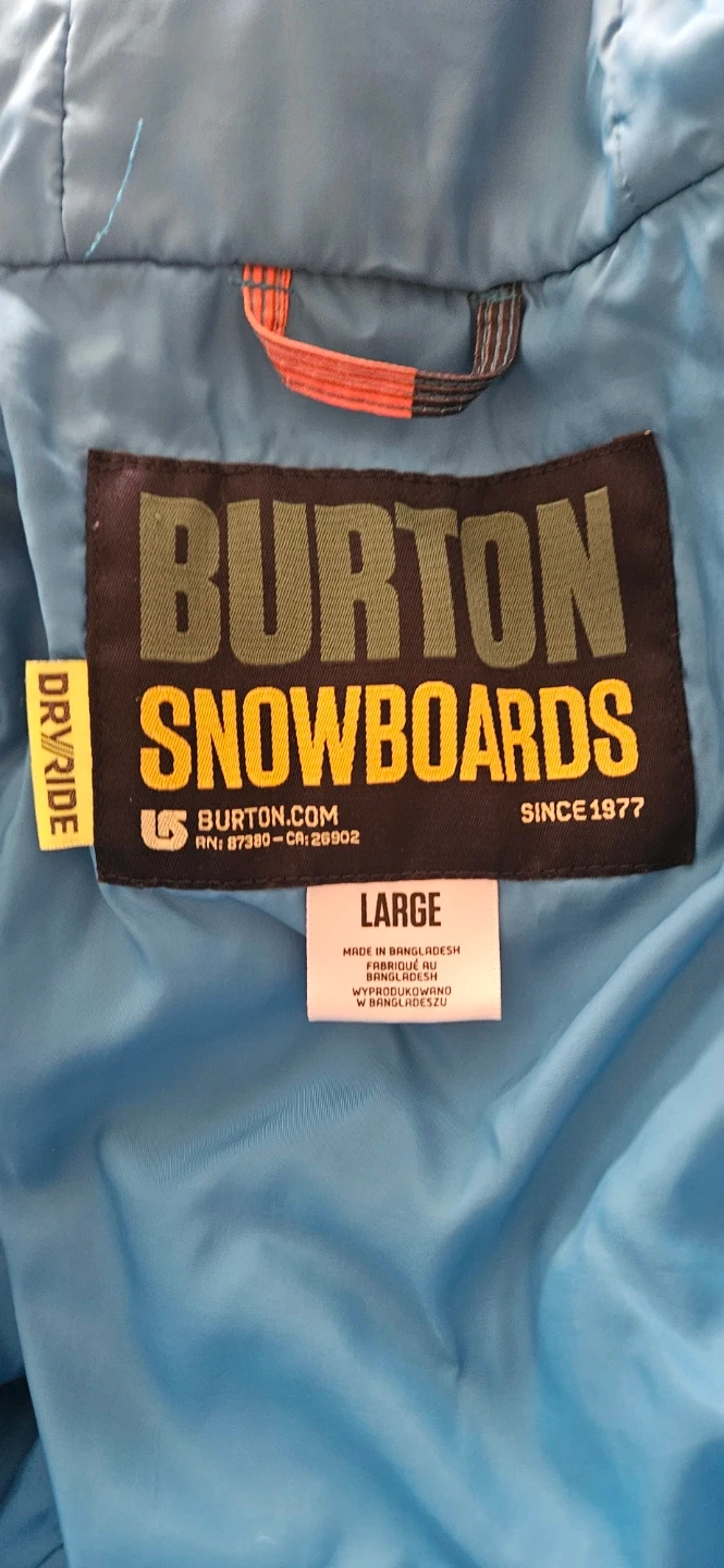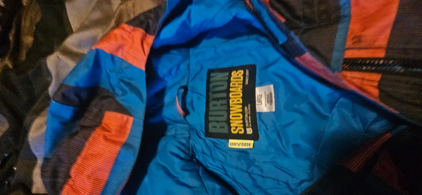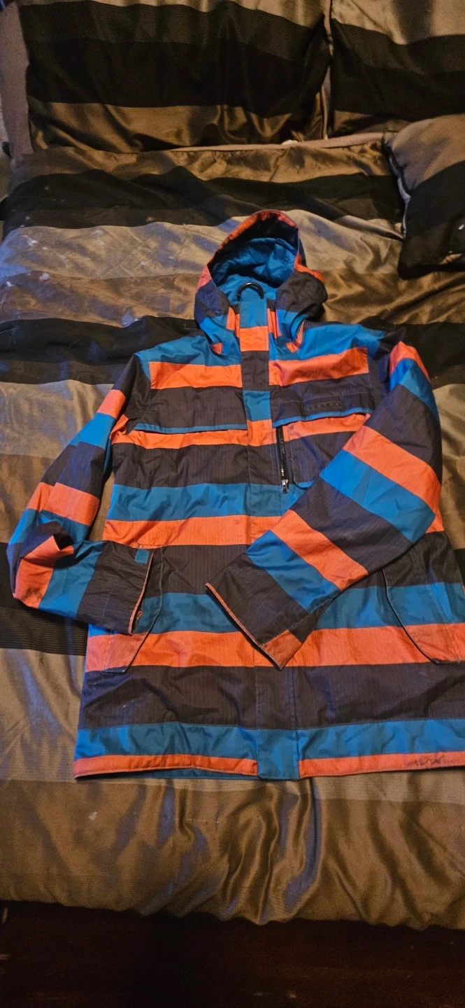 Burton Snowboards jacket in size large. It's in great shape and ready for the slopes! The jacket features DRYRIDE technology to keep you dry and comfortable. The colours are a mix of blue, orange, and black in a striped pattern.