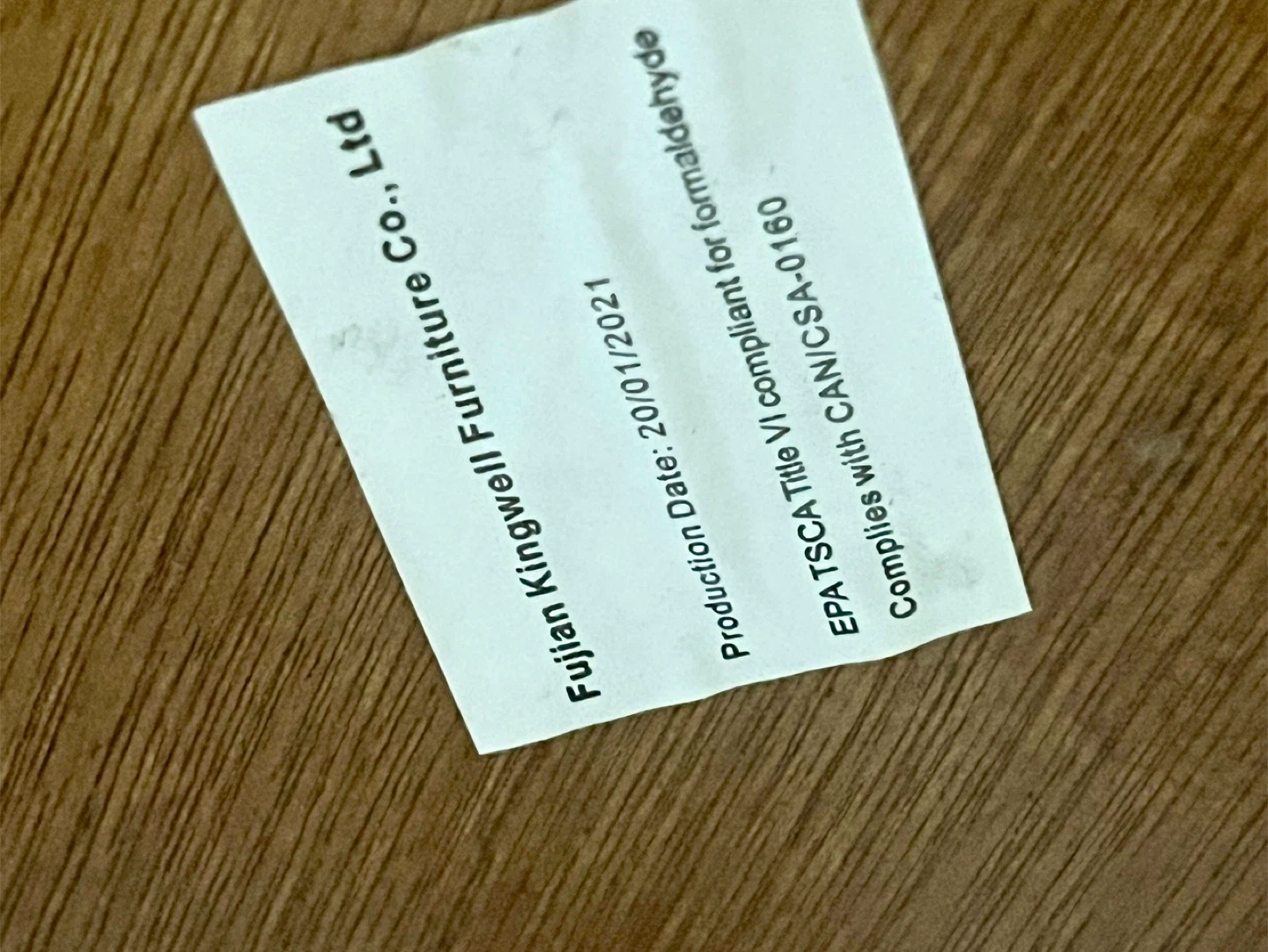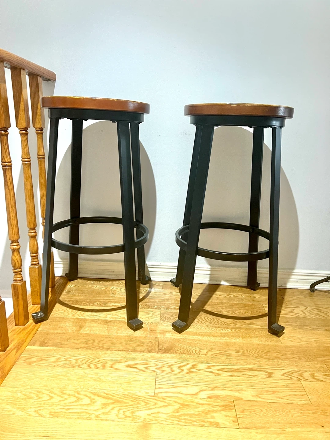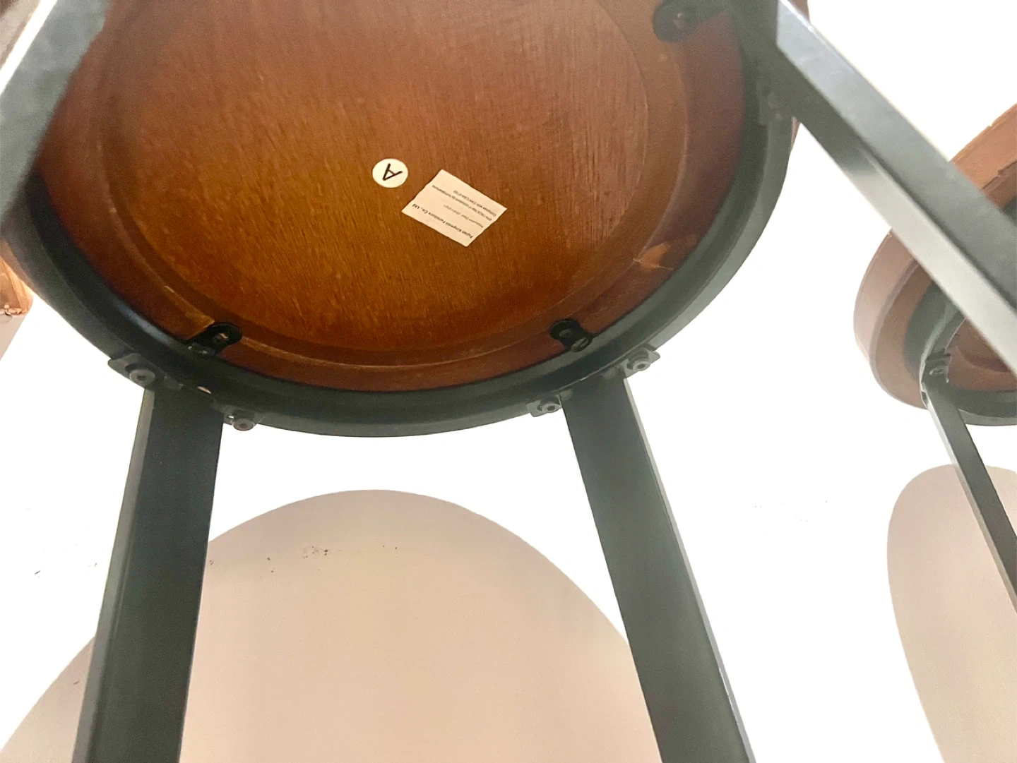 Selling a sett of 6 bar stools from Fujian Kingwell Furniture Co., Ltd. They feature a wooden seat and a metal frame. The production date on the tag is 2021 January 20.