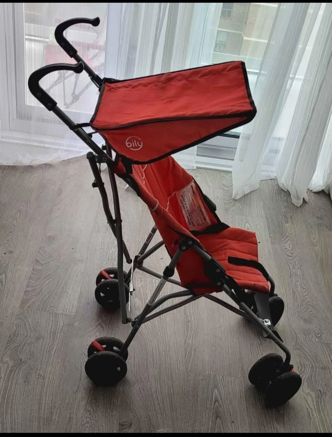 Selling a Bily baby stroller in red. Foldable baby stroller. It's in perfect condition and ready for a new little one!