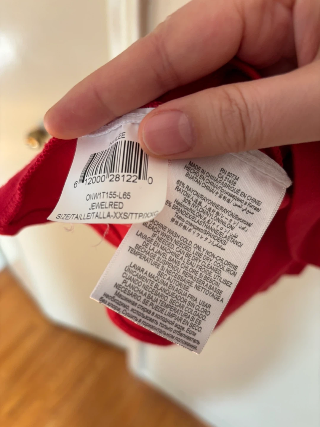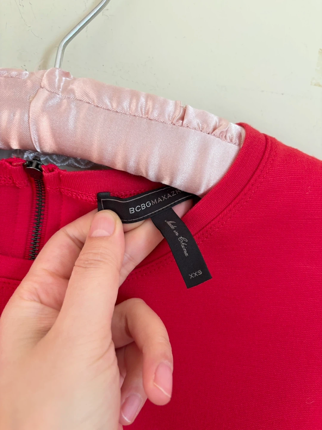 This is a BCBGMAXAZRIA Jeweled Top in size XXS. It's a vibrant red colour and made of a blend of 65% rayon, 30% nylon, and 5% spandex. Perfect for adding a pop of colour to your wardrobe!